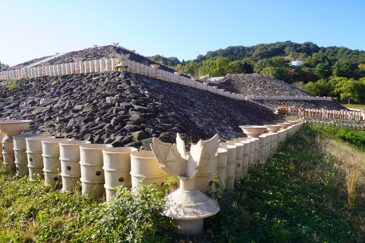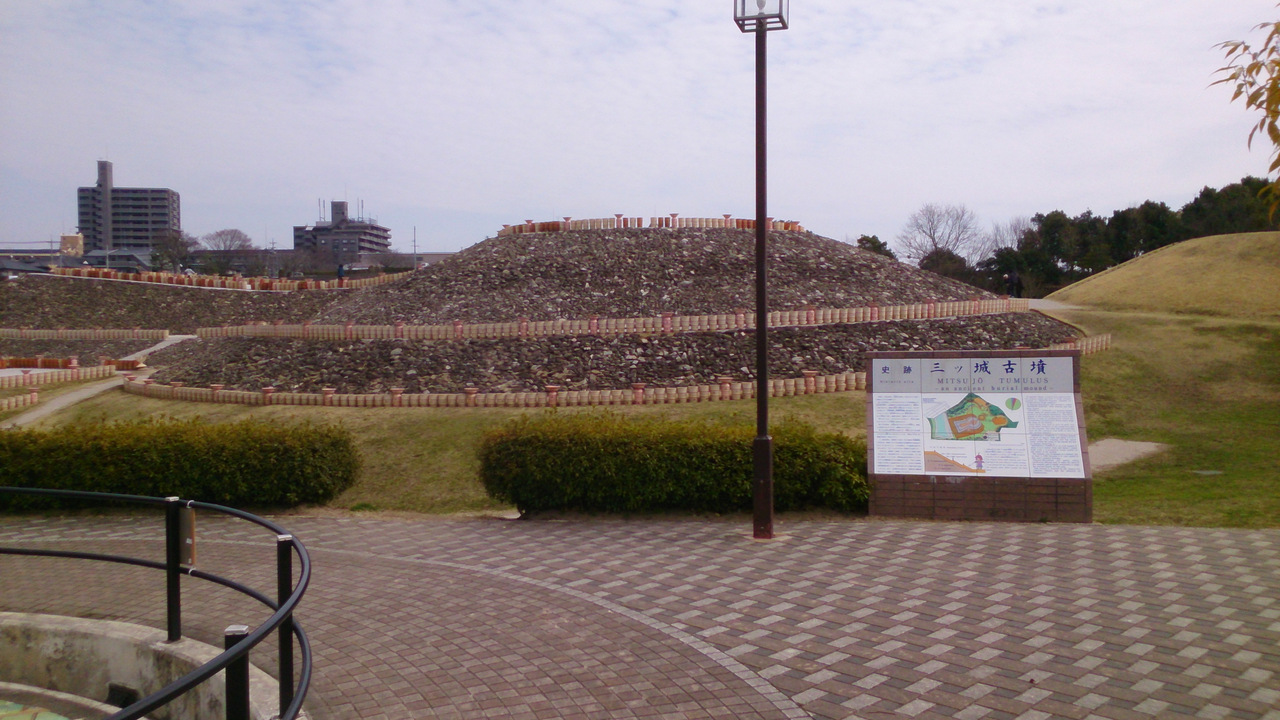 西条盆地の中央、八幡山から北に伸びる丘陵の先端に三ッ城古墳は造られました。全長約92メートル、後円部の直径約62メートル、高さ約13メートル、前方部の幅約66メートルで、国史跡に指定されている県内最大の前方後円墳です。埋葬施設が後円部に3基あり、中から鏡や玉類・武器などの副葬品が多量に出土し、それらの副葬品などから5世紀前半頃の築造と推定されています。また、墳丘には葺石が葺かれ、1,800本の円筒埴輪や動物・武具・家などの形象埴輪が置かれていました。 現在は、公園として整備され、築造当初の姿に復元されていす。なお、出土した副葬品や埴輪などは、東隣の中央図書館ガイダンスコーナーに展示されています(休みは図書館に準じます)。