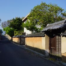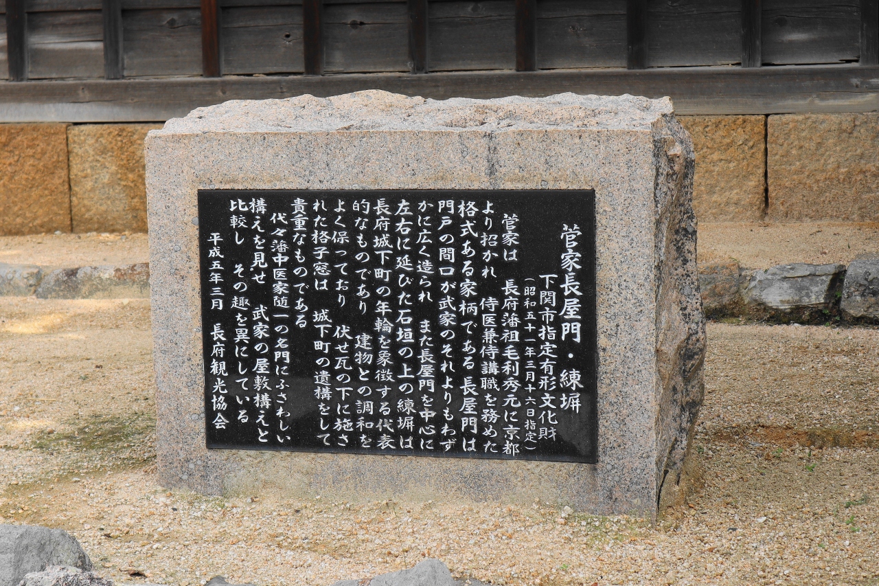 長府毛利藩は天保年間に「達豊浦家中一統家作定書」を発令し、藩士の身分により家屋造作の制限を行いました。 城下町長府の特色は、門や長屋それに続く練塀と石垣、その内側の植裁など、街路に面した構えにあります。形態としては、切り盛りした土地に石垣を築き、その上に粘土を練り混ぜた土塀を築く方法で、中塗りを施しただけのものが多く、漆喰で上塗りしたものは見られません。