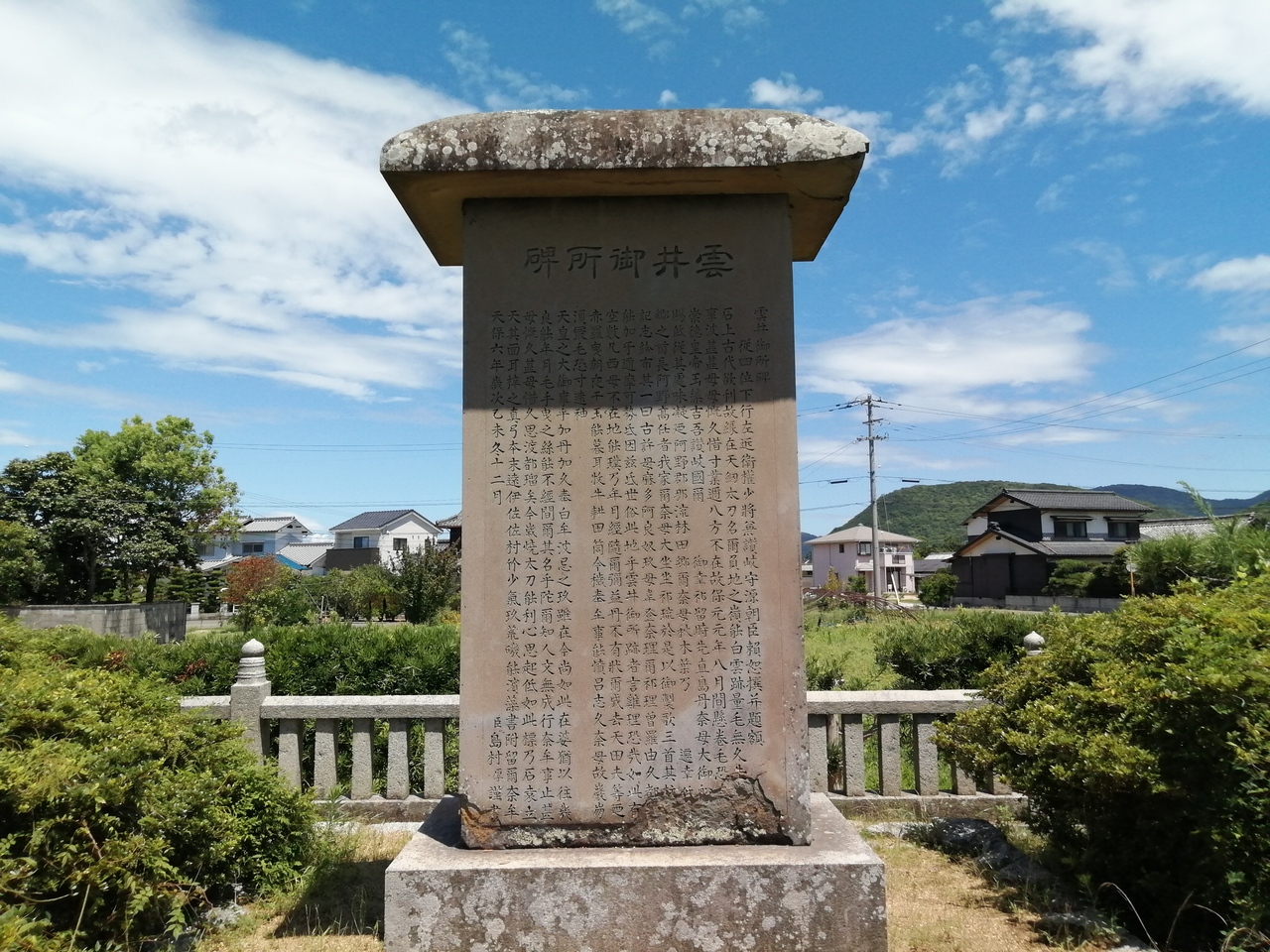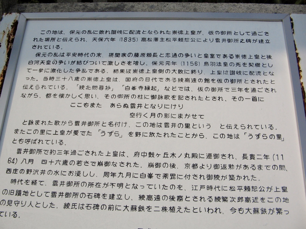 187号線を林田方面に向かい白峰中学校のあたりで四つ辻(16号線)を西に向かいます。綾川に出ますから川の手前を数m北に上が... 続きを読むった所から河原を東側下に降りる道がありますからそこを降りた行き止まりが雲井御所跡です。気を付けてみていないと見逃してしまうほど質素な感じで田んぼの中に鎮座しています。