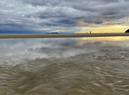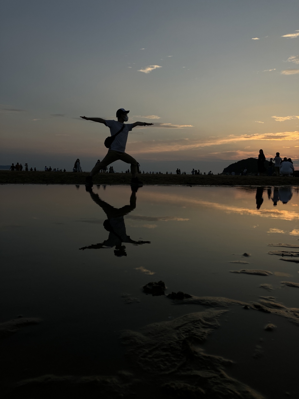 砂浜の水たまりの水面が鏡上に見え、人影が綺麗に映る
