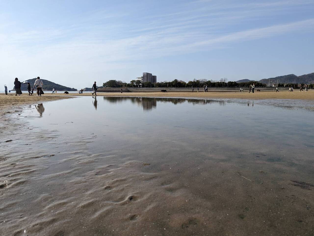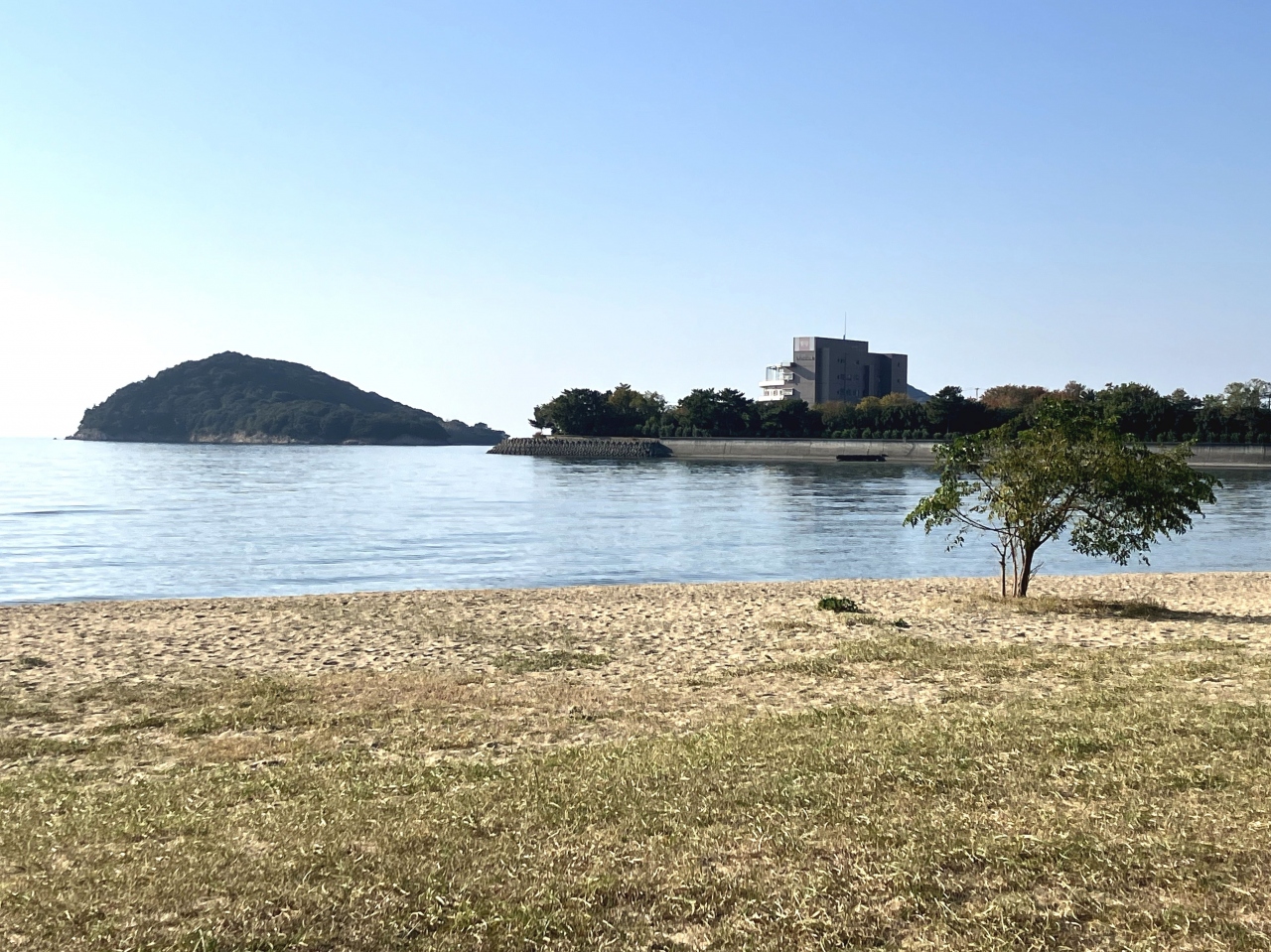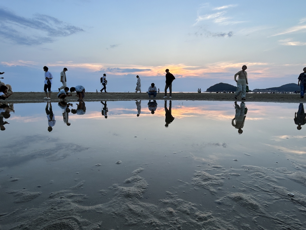 1kmにわたる白砂が特徴的な浜。瀬戸内海の穏やかな波が打ち寄せる、広いビーチです。最近は、南米のウユニ塩湖のような写真が撮れると話題にもなっている素晴らしい夕景のスポットにもなっています。