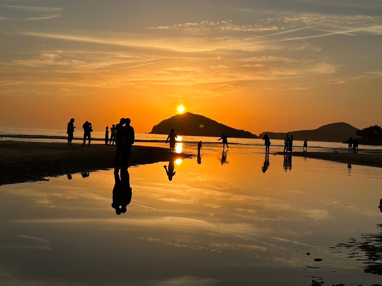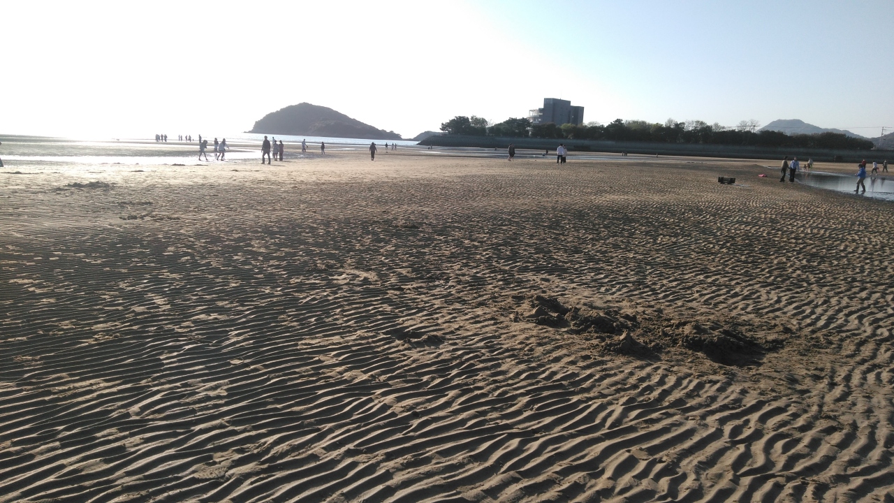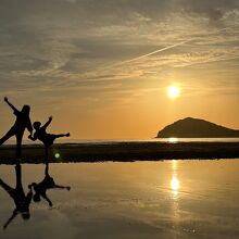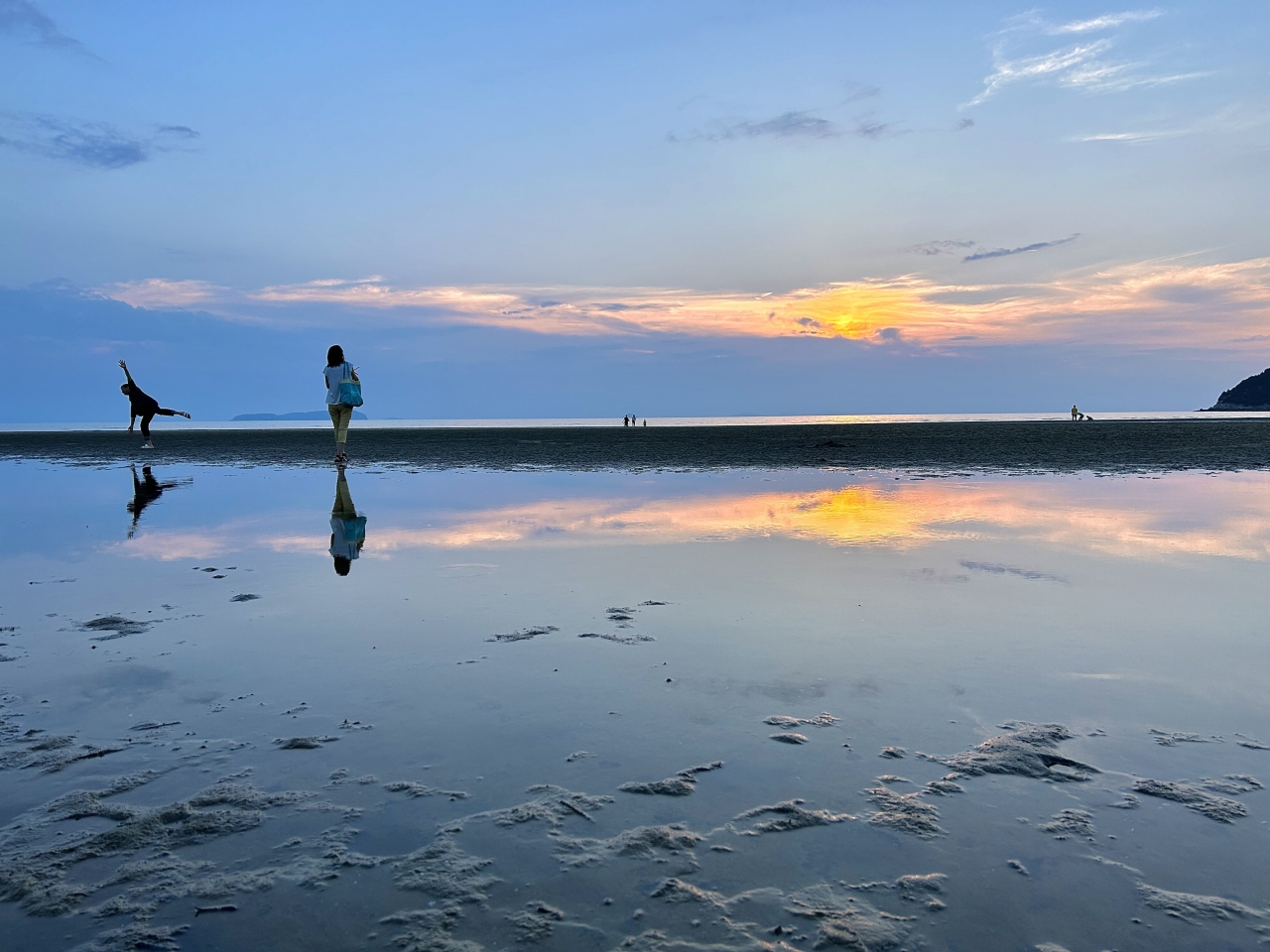 砂浜はゴミなどほとんど落ちておらず、とてもきれいです。昼間は普通の砂浜ですが、夕暮れ前から日の入り直後にかけてとてもきれいな景色になります。