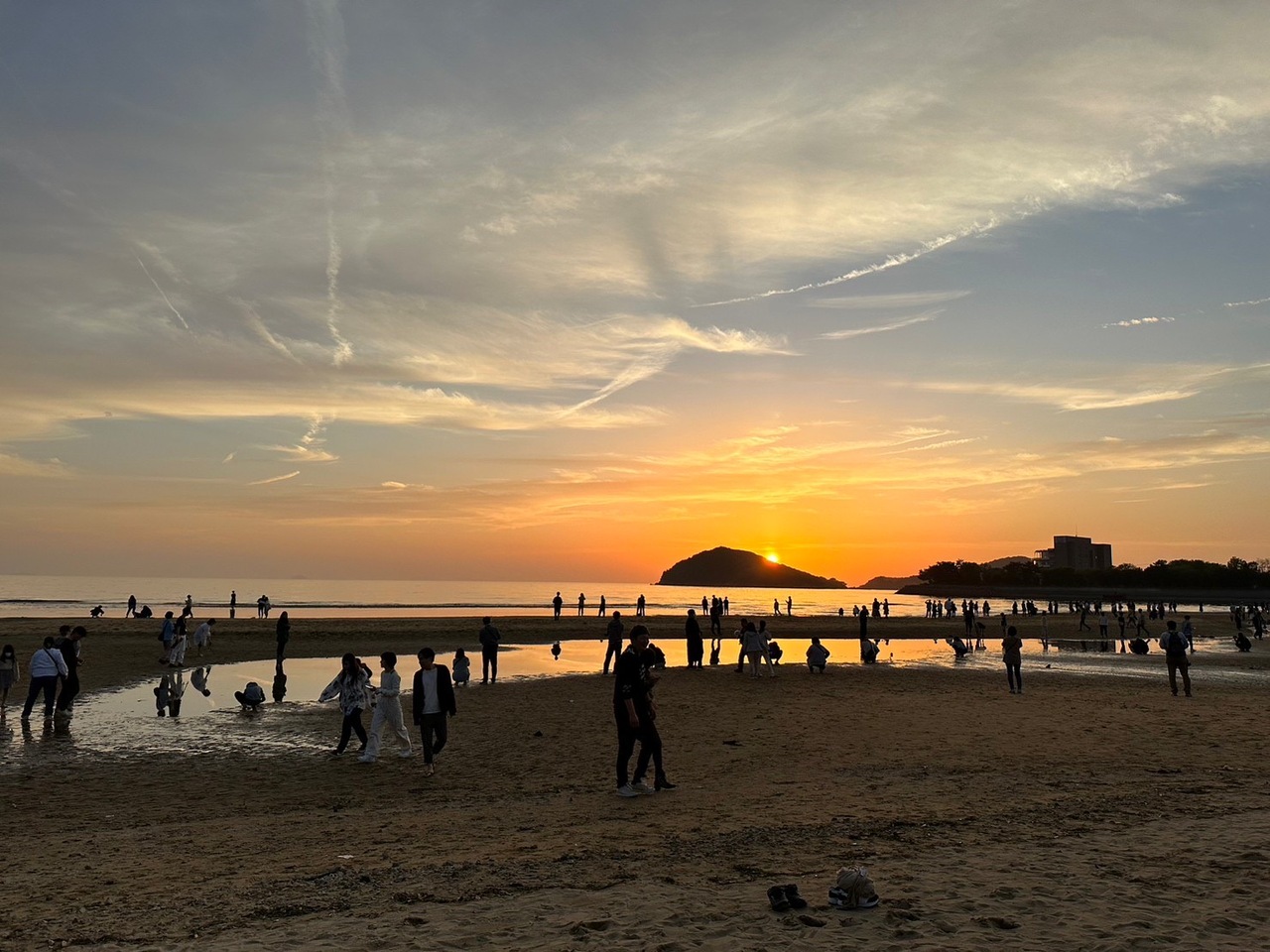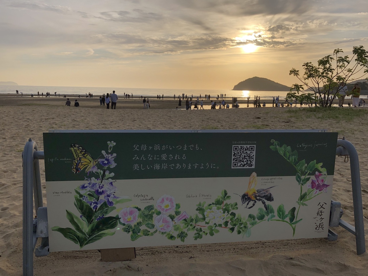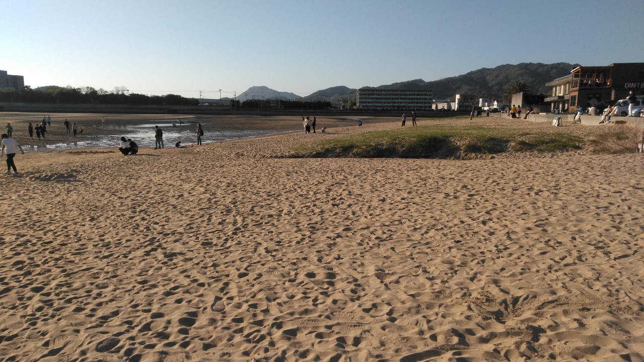 砂浜はゴミなどほとんど落ちておらず、とてもきれいです。昼間は普通の砂浜ですが、夕暮れ前から日の入り直後にかけてとてもきれいな景色になります。