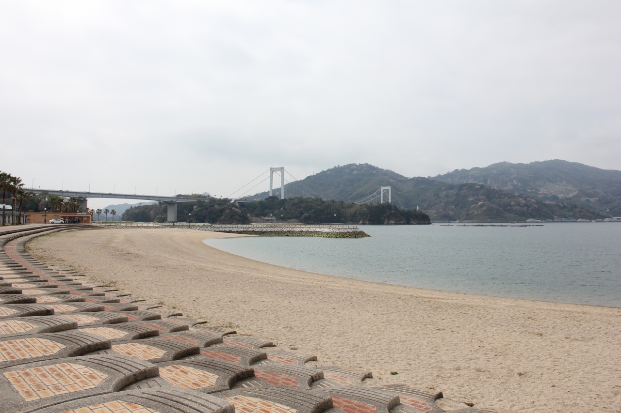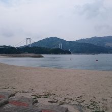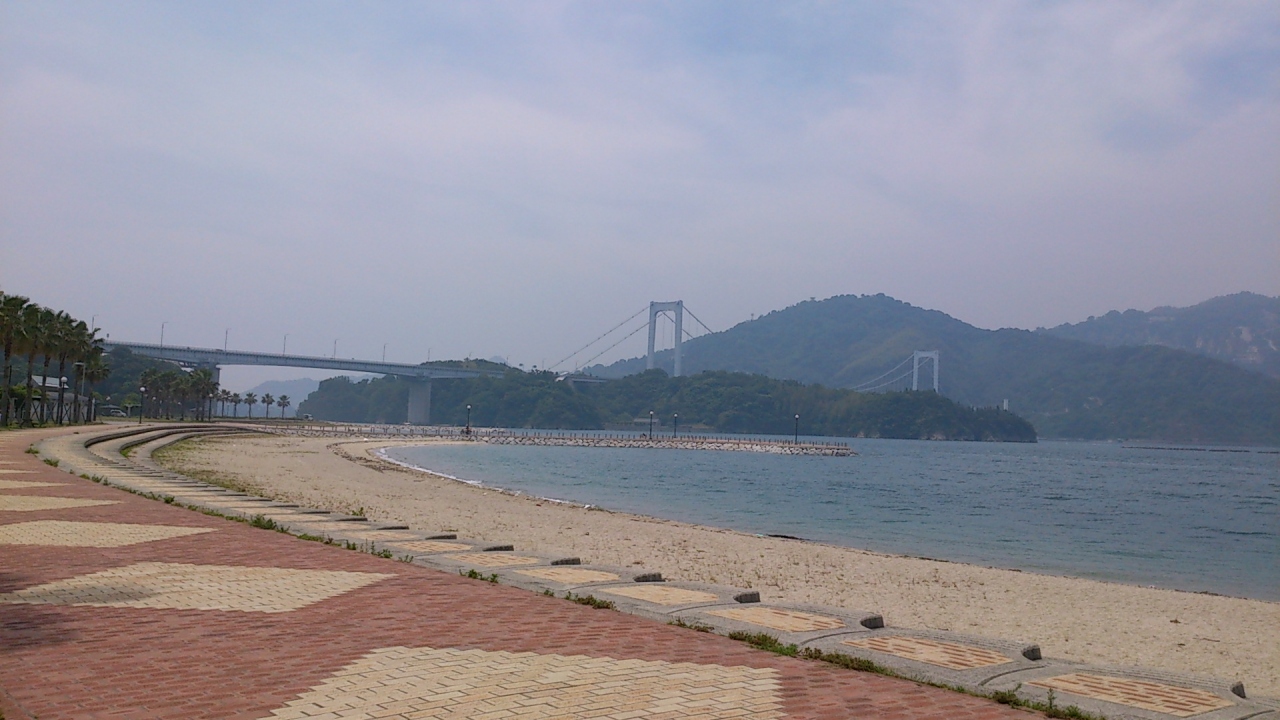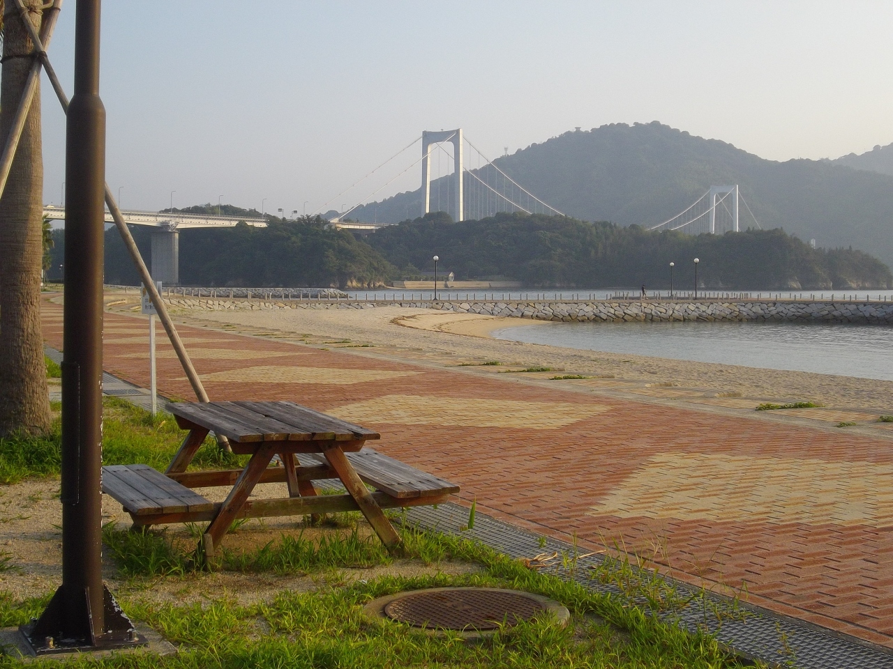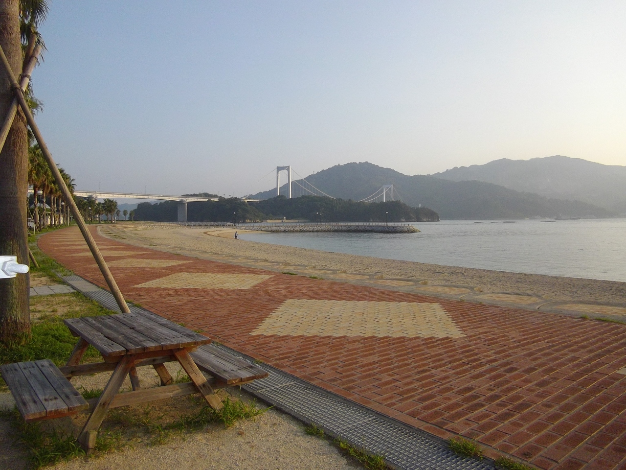 伯方・大島大橋のたもとの伯方S・Cパーク内にある人口ビーチで、夕日に照る橋の眺められるところです。