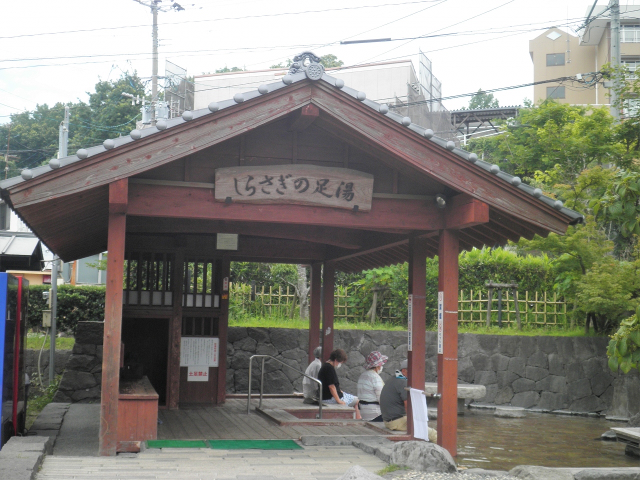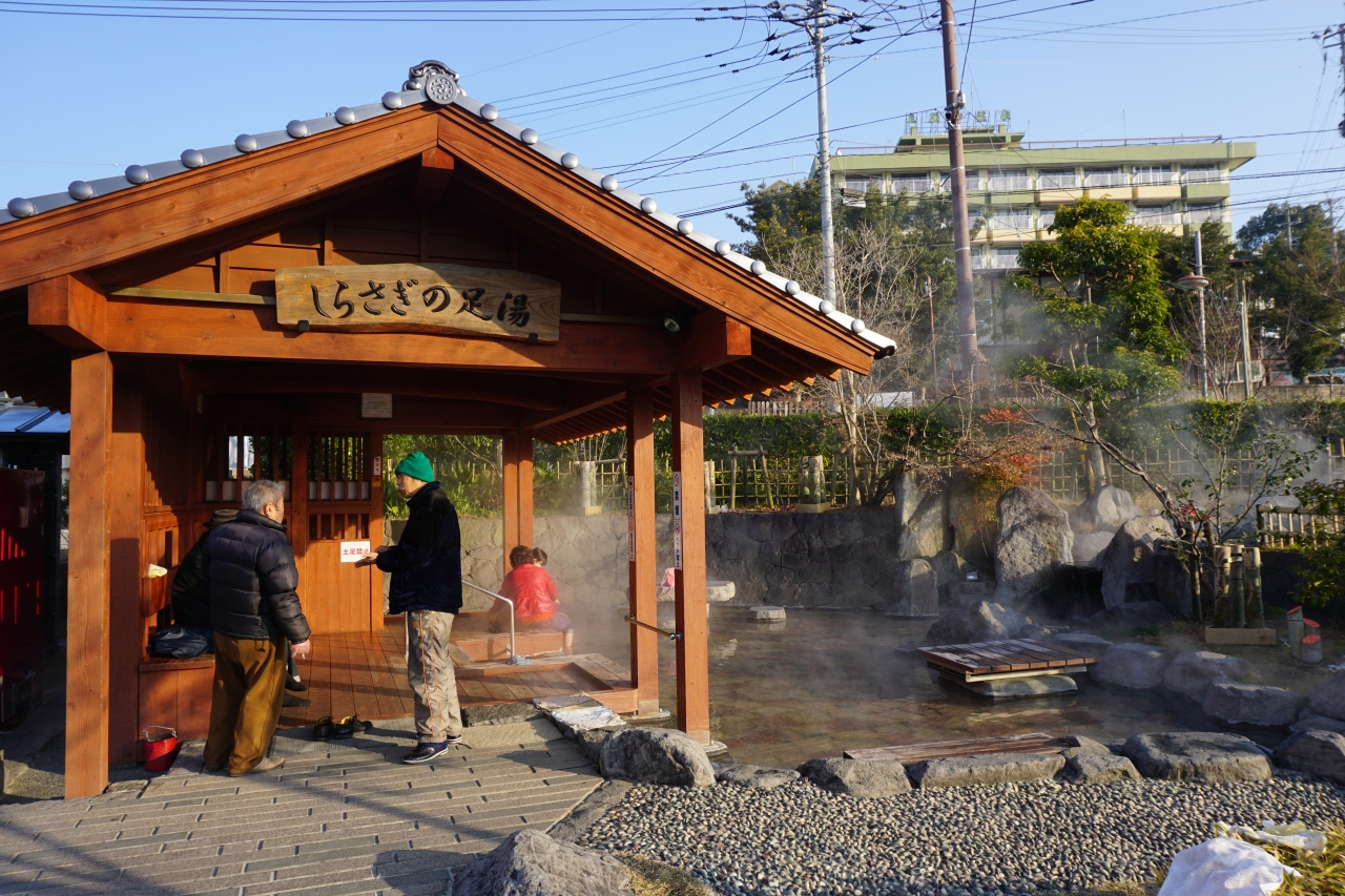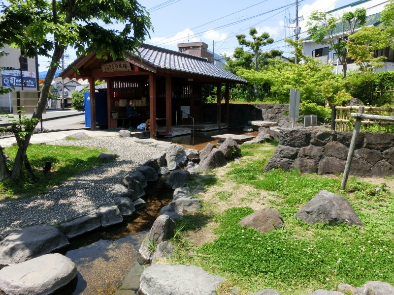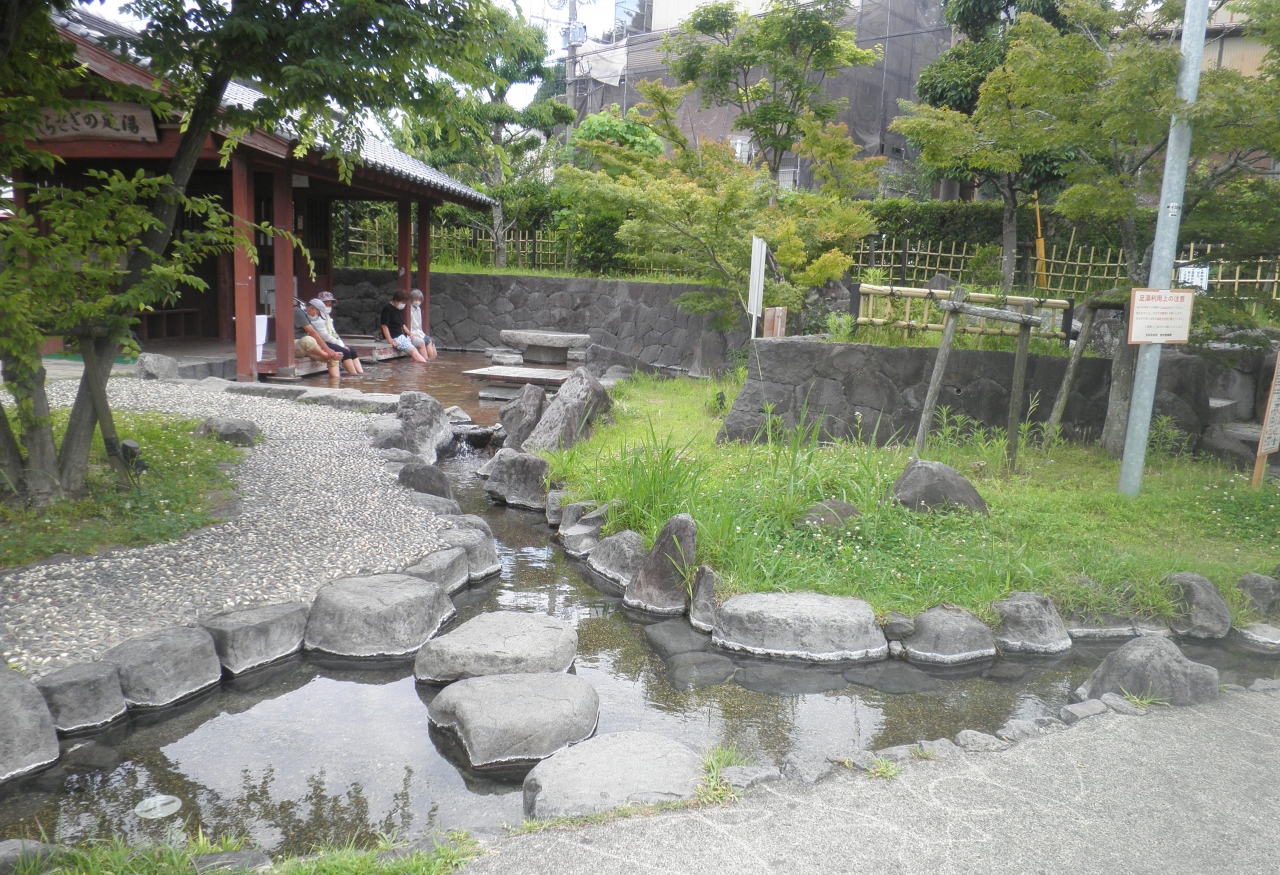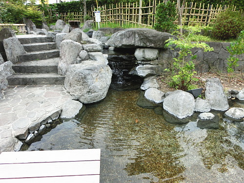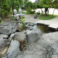 足湯は公園の端の方にあり、そこから流れ出た水(お湯が)庭園風に公園内を流れていて、思っていたよりもお洒落な感じです。多くの方が足湯を利用されていて、地元の方に親しまれている感じが伝わってきました。