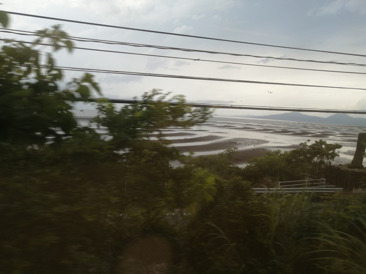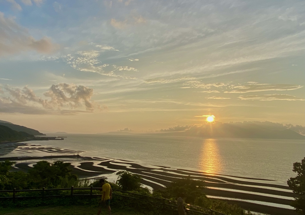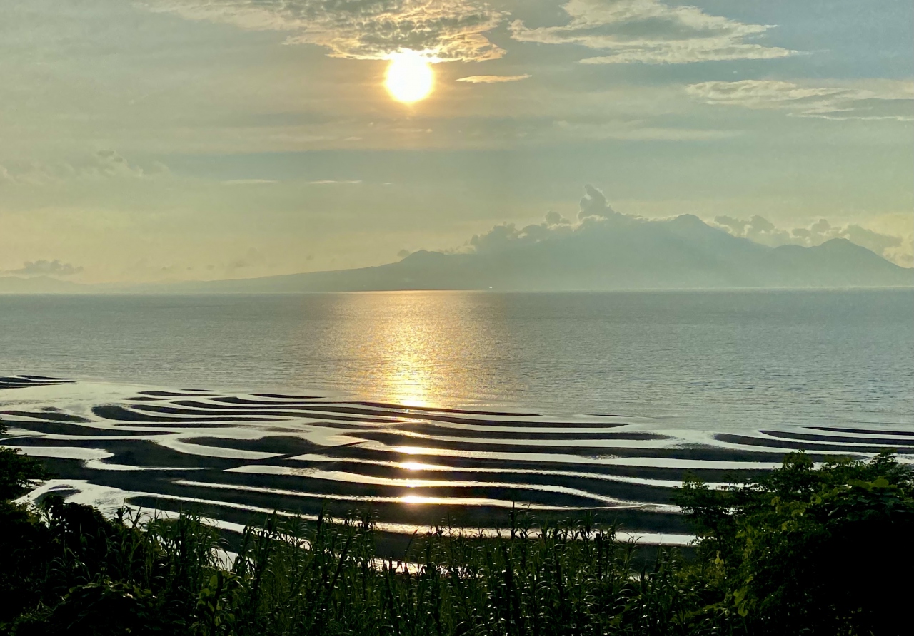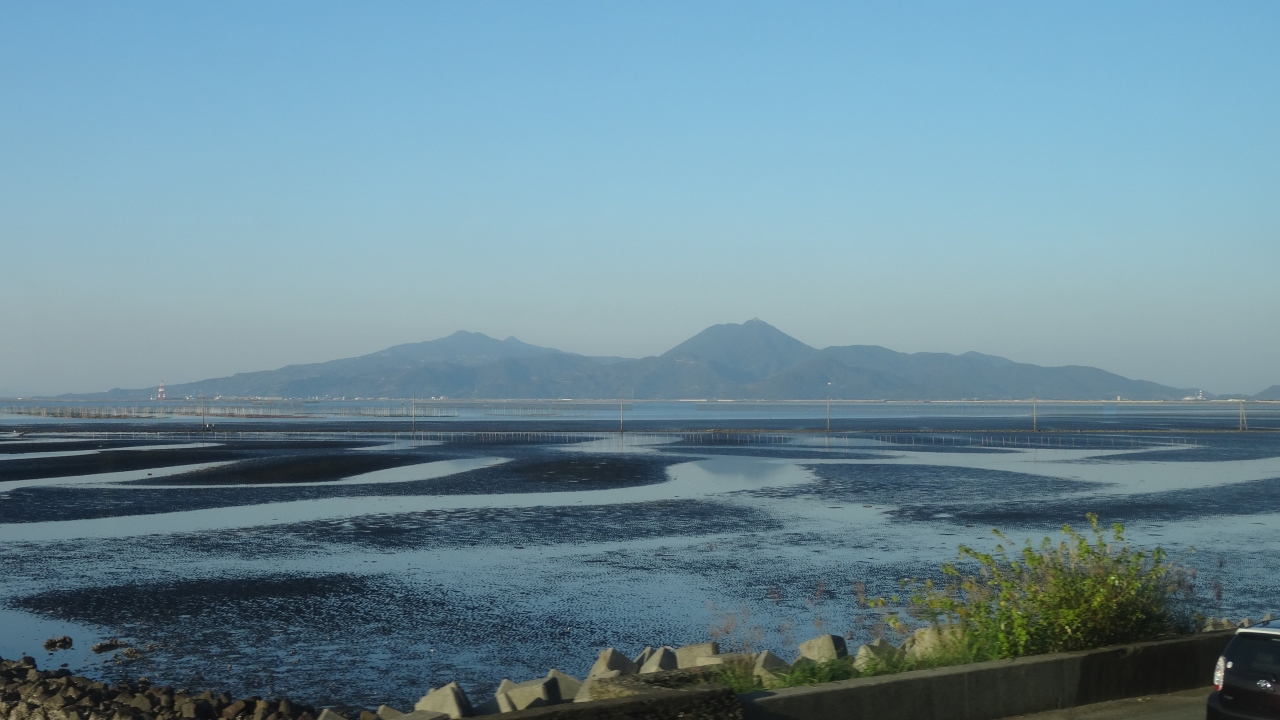 その日は快晴で、運よく潮が引いた時間帯だったため、夕陽に焼けた砂紋を綺麗に眺めることができました。最初は、島原湾の向こうに雲仙岳を望むことができ、そして、列車が進むにつれ、徐々に金峰山がくっきりしてきました。