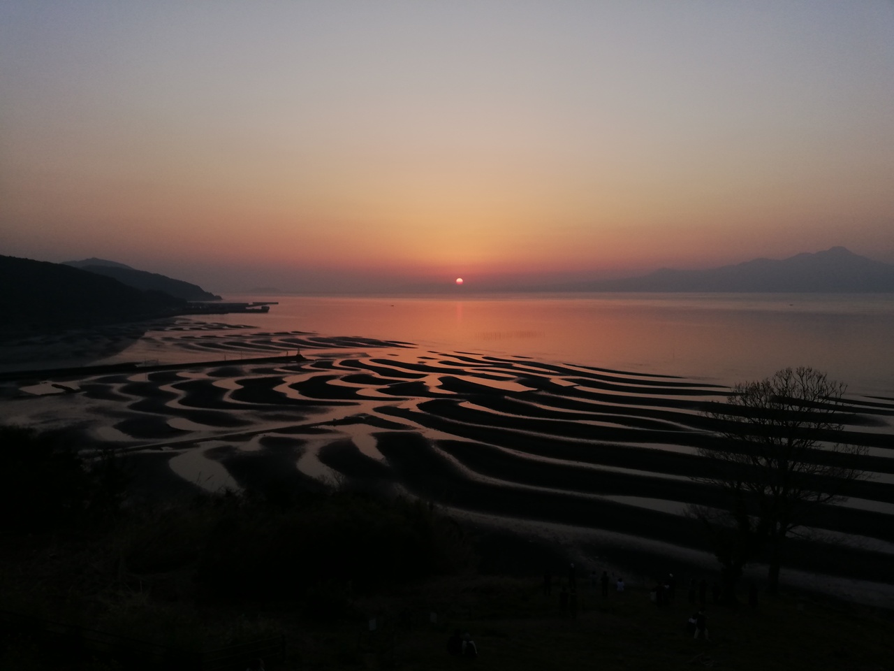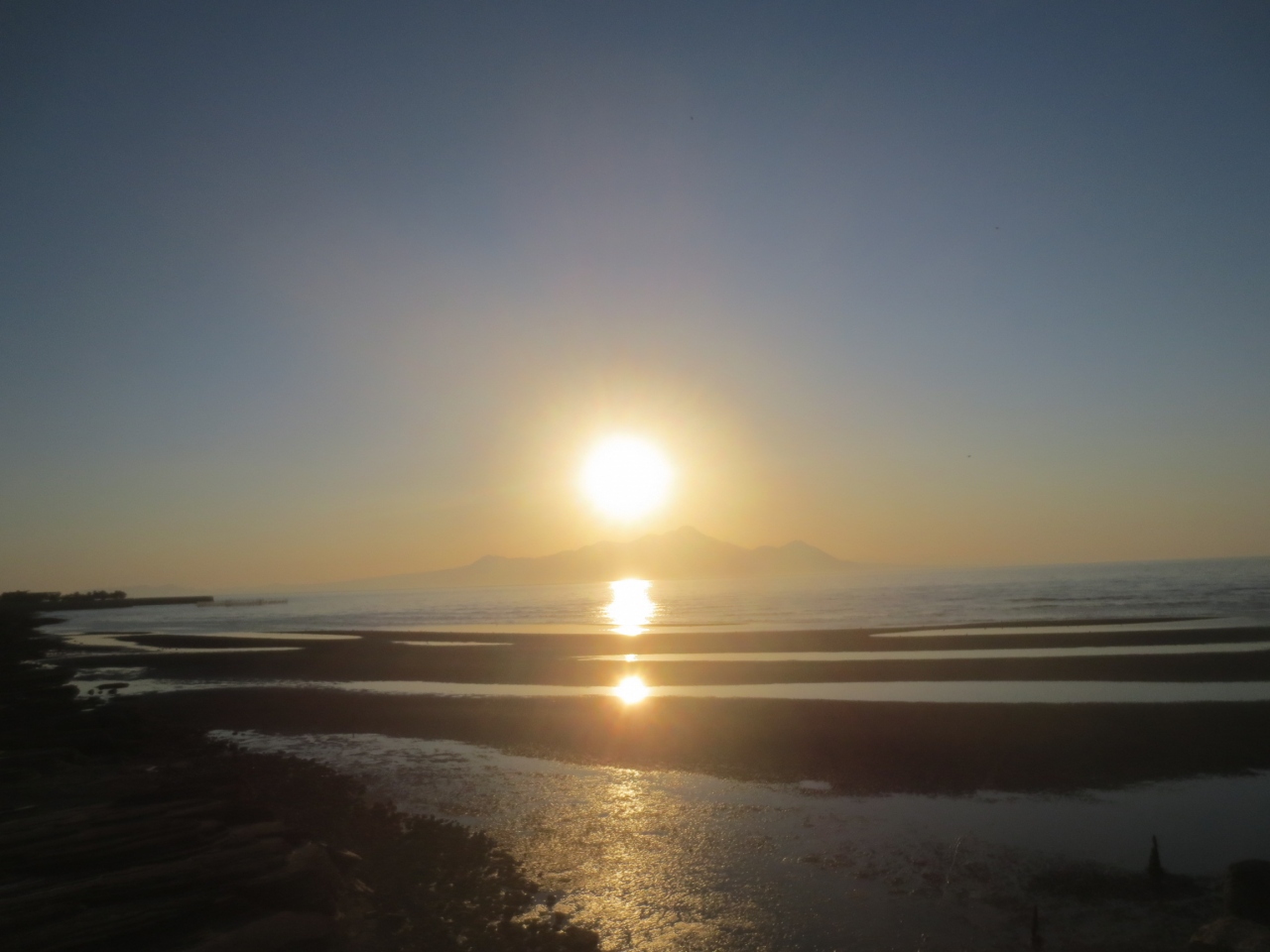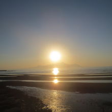 日没前は三日月型の干潟が広かったですが、だんだん潮が満ちていったので干潟がだんだん狭くなってしまい、サンセットの頃にはイマイチになってしまいました。また普賢岳が少し雲に隠れていたのが残念でした。海に沈む夕陽とのコラボは1月から4月がベストのようです。夏は普賢岳に沈みます。