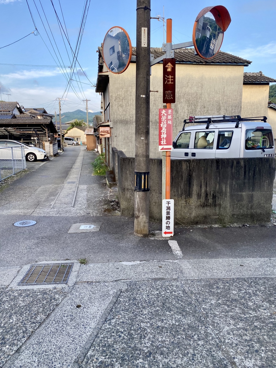 駐車場入口横の道を登って行くと戸口大橋を渡ります。山の頂上付近には電波塔、展望台、赤い鳥居が見えています。海岸沿いを奥まで進むと民家が立ち並ぶ地区になり、大榮神社への道標の方向に向かいました。要所には「干潟景勝の地」と書かれた道標があるのでわかりやすいです。民家を過ぎると山道を少しづつ登ります。赤い鳥居が見えたら、まずは大榮稲荷神社(個人で作られた神社)に参拝。