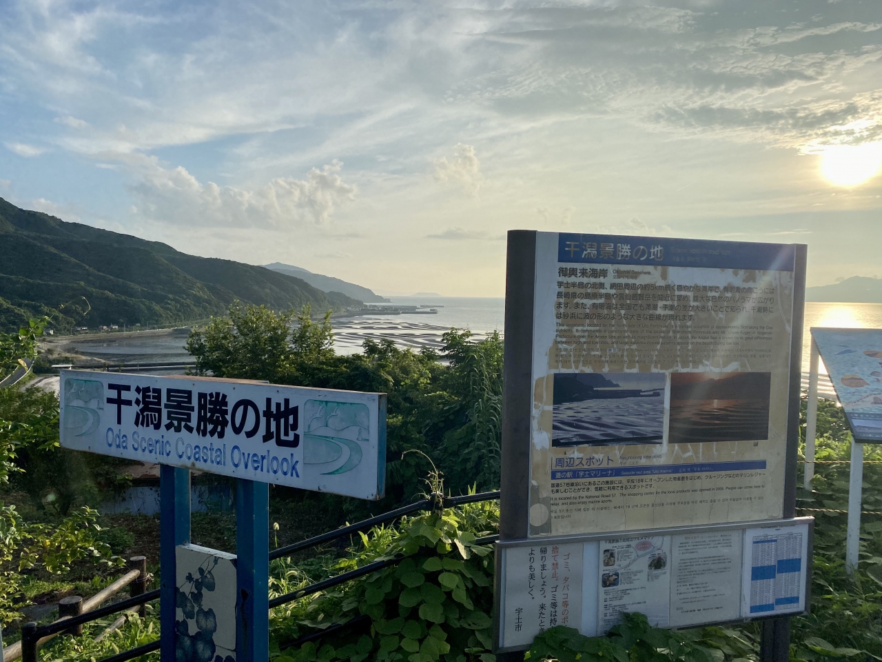展望台横の解説板には名前の由来が記載されており、天皇が御輿をとめて魅入られた伝説からのようです。サンセットだけでなく、日中の煌めきや月夜の干潟も魅力的な写真が掲載されていました。
