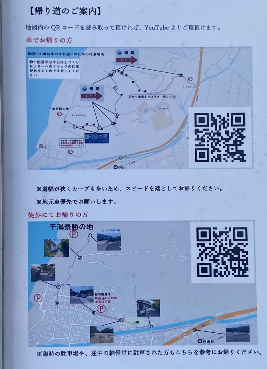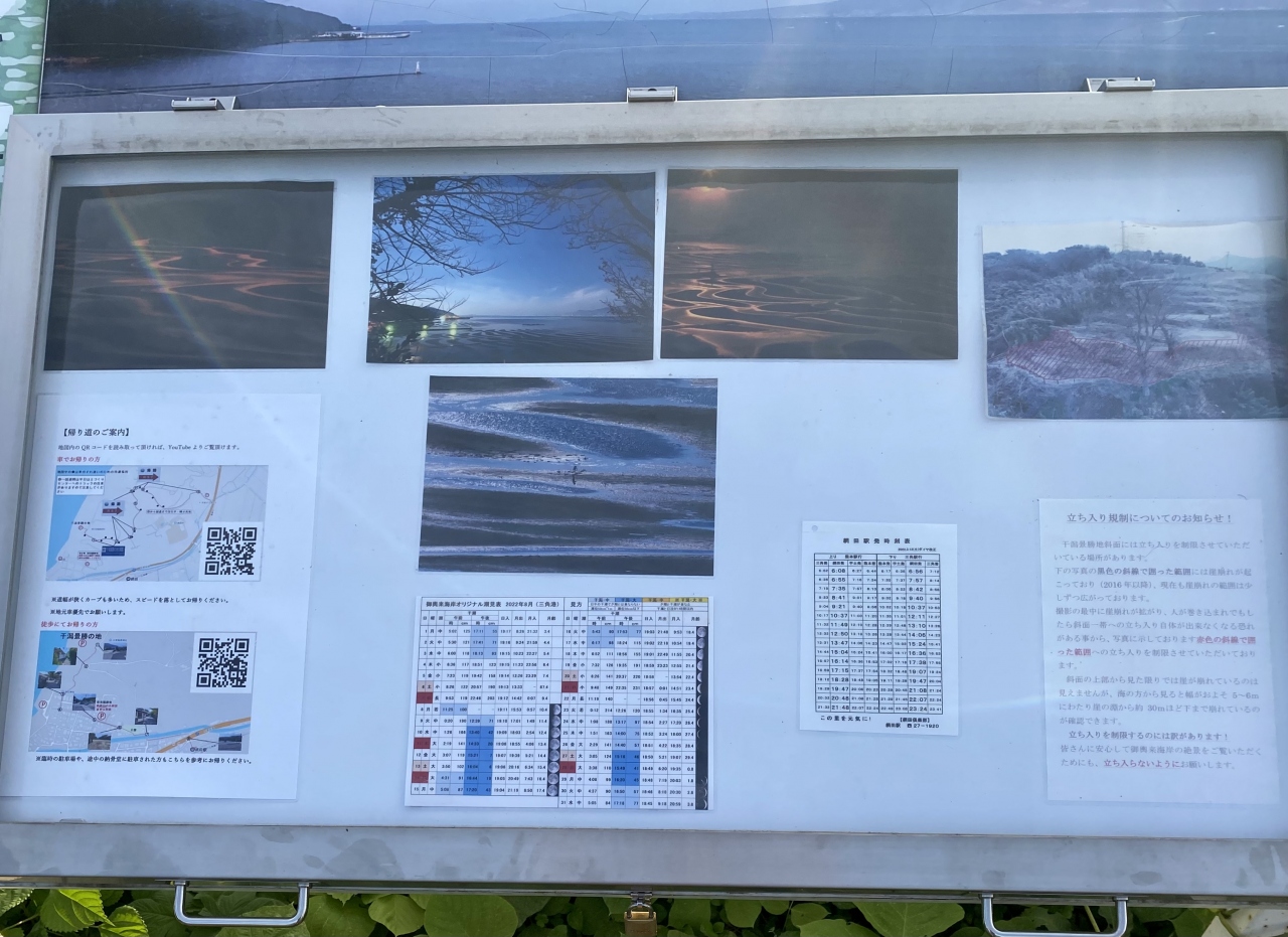 神社から少し歩くと展望台でした。駐車場には空きがありましたが、大きな車だとすれ違いが厳しいので、歩いてきて良かったと思いました。インスタなどで一躍有名になった御輿来海岸は、おこしき海岸と読みます。展望所には案内板があり、こちらへの往復のルート地図(離合不可の狭い道なので一方通行とされています)、潮見表(干潮時しか三日月型の干潟は見られませんが御輿来海岸ホームページで確認できます)、電車の時刻表(駅から展望台まで歩いて16分)がありました。