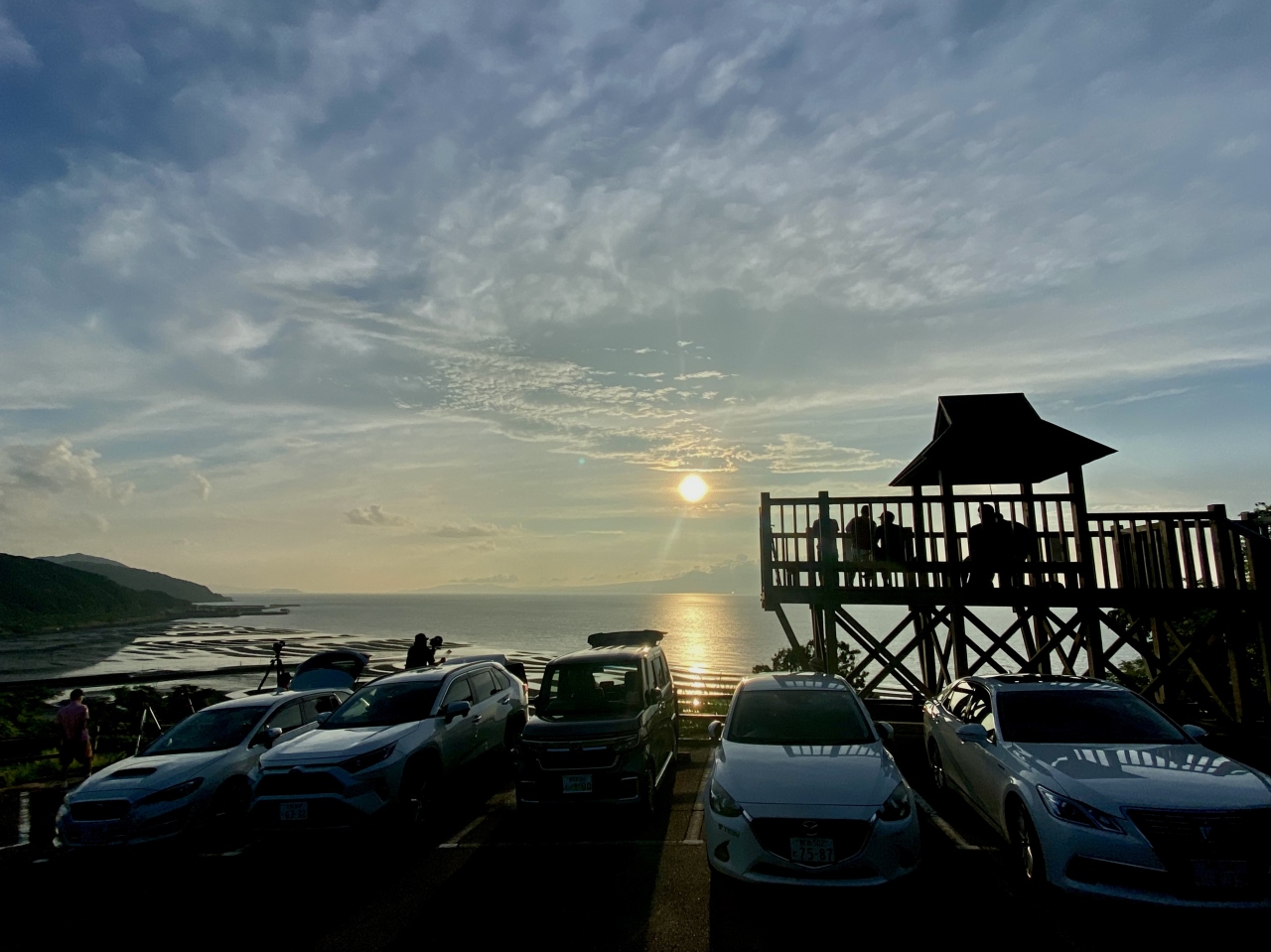 山の上にある展望台駐車場までは道が狭く台数もあまりとめられないということなので、最初から57号線道路沿いの網田海岸公園(トイレもある広い駐車場)の駐車場にとめて20分ほど歩いて登りました。日没の1時間前には展望台に着いておく方が良いです。