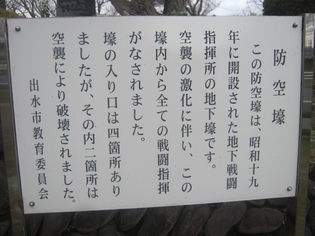 元々ここには旧出水海軍航空隊飛行場があり、今でもそれに関連する遺構が付近に点在していますが、それらに関しては、この公園内のメインともいえる、中に入れるようになった地下壕入口に詳細なパンフが用意されているので、こちらを持参の上で付近を散策されると良いです。