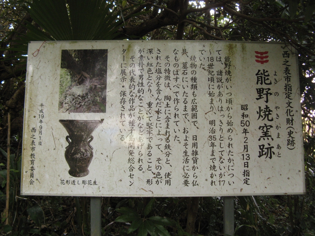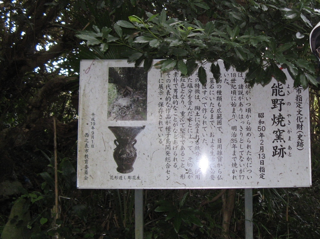 「能野焼」は、江戸時代中頃~明治35年まで作られていた陶器で、壺や食器、花器、墓など種子島内で使用するありとあらゆる陶器を... 続きを読む作っていたそうで、その登り窯があった場所です。西之表市の文化財に指定されています。