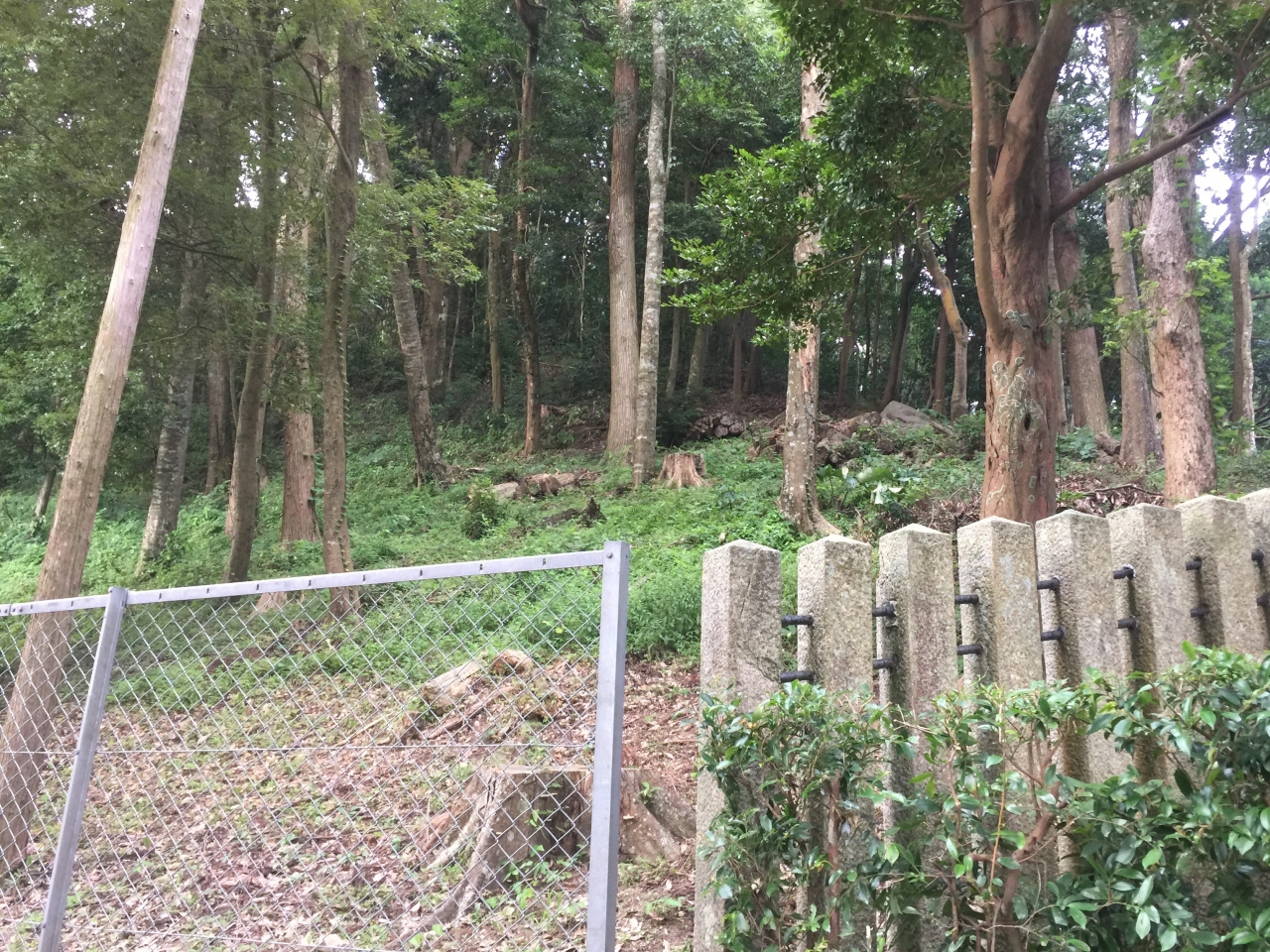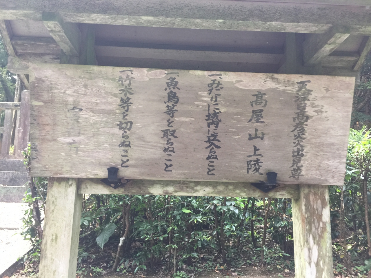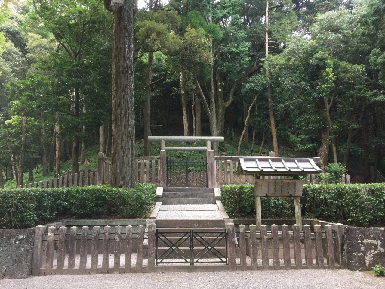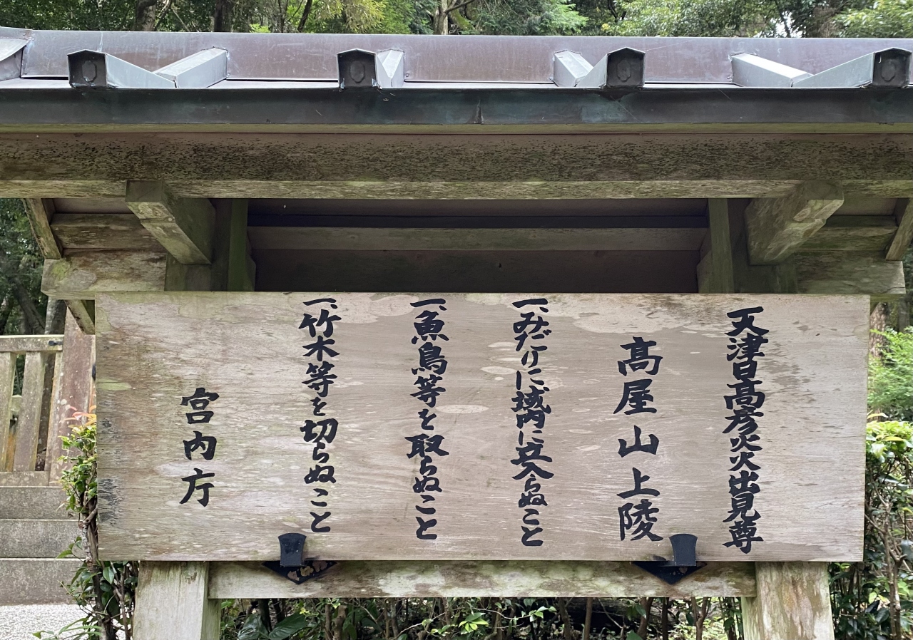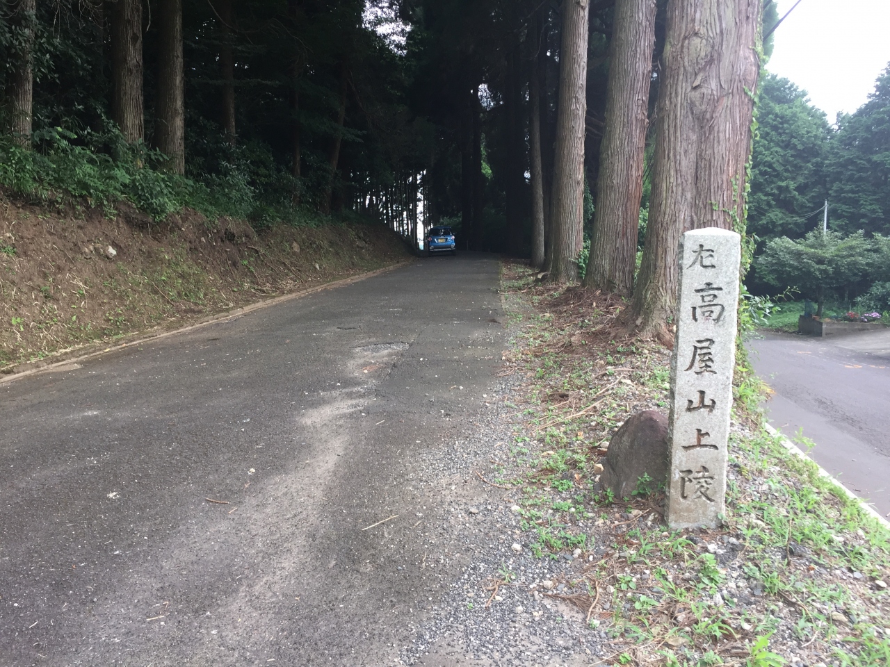 車をとめた空き地先の道路右側には「高屋山上陵」の石碑があります。参道っぽい杉林を登っていくと、車止めがありさらに登ると拝所がありました。宮内庁管轄なので中に入ることはできませんが、独特の神聖な空気が流れています。