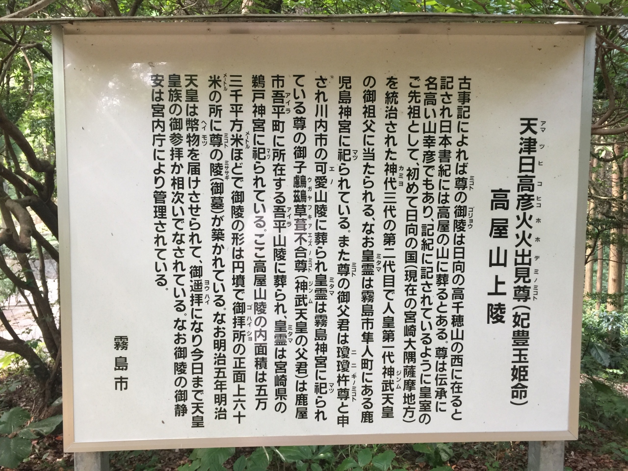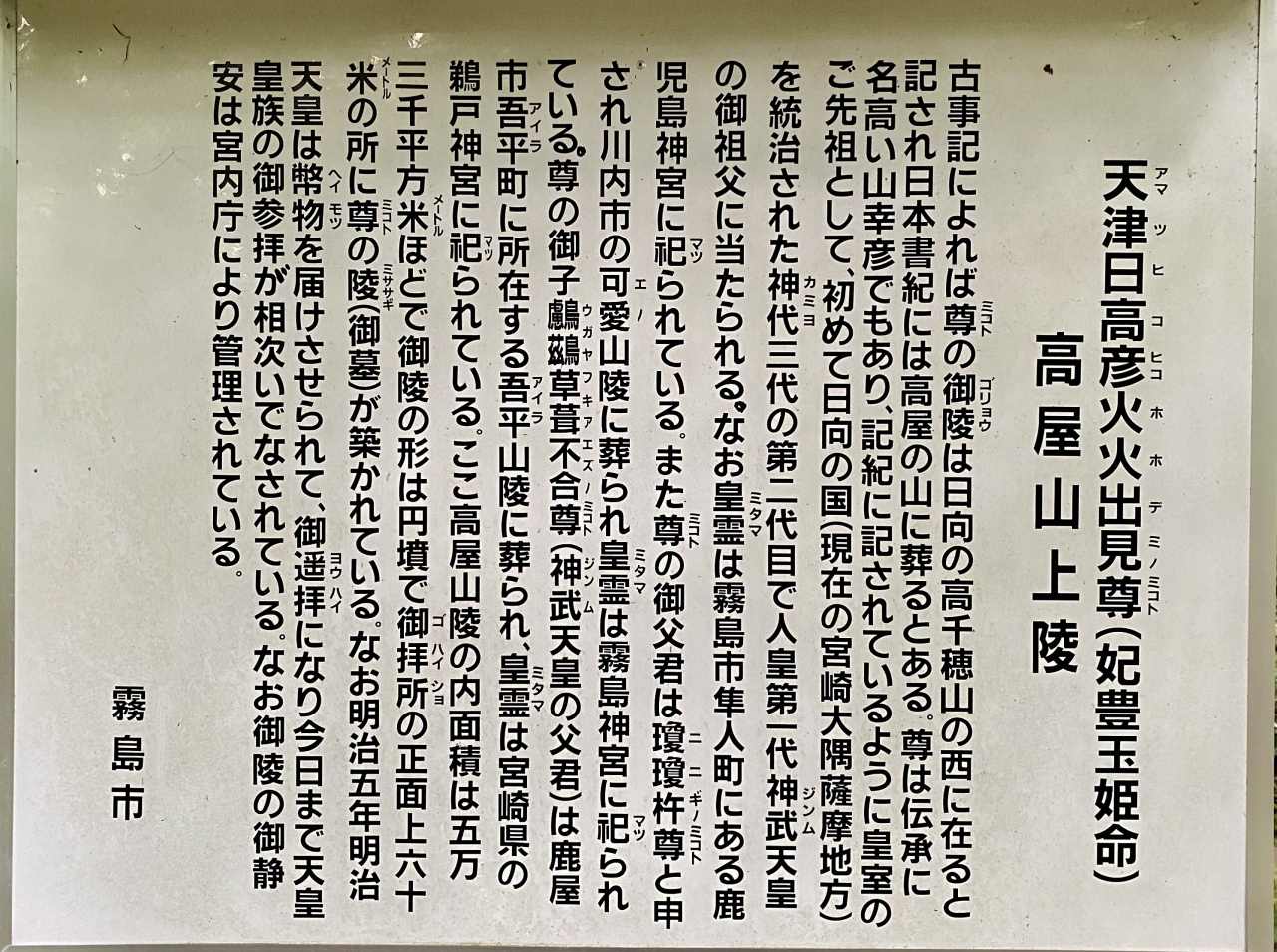 高屋山上陵はヒコホホデミ(ホオリ)尊の陵墓です。天照大神の命で天下った天孫ニニギノ尊の子供で、また初代天皇神武天皇のお爺ちゃんにあたります。別名山幸彦とも呼ばれ、浦島太郎のモデルとしても有名です。産まれたのは薩摩半島南部にある笠沙町で、その後、高千穂宮を建てました。その宮址が鹿児島神宮(正式にはその隣の石體神社)」となっています。