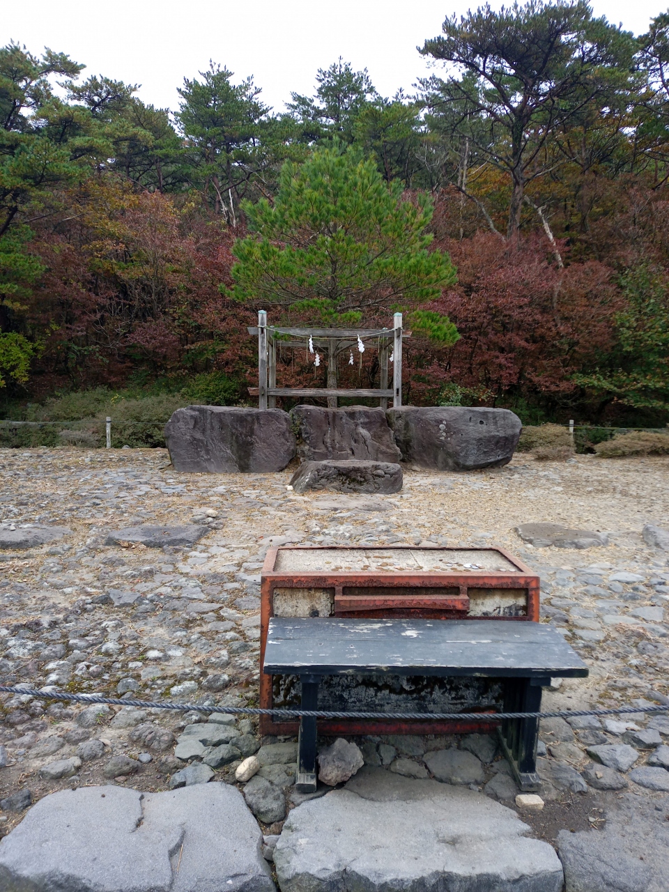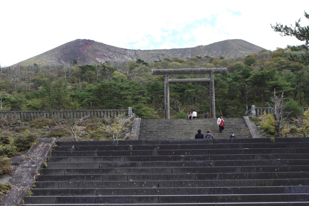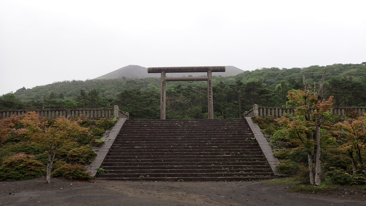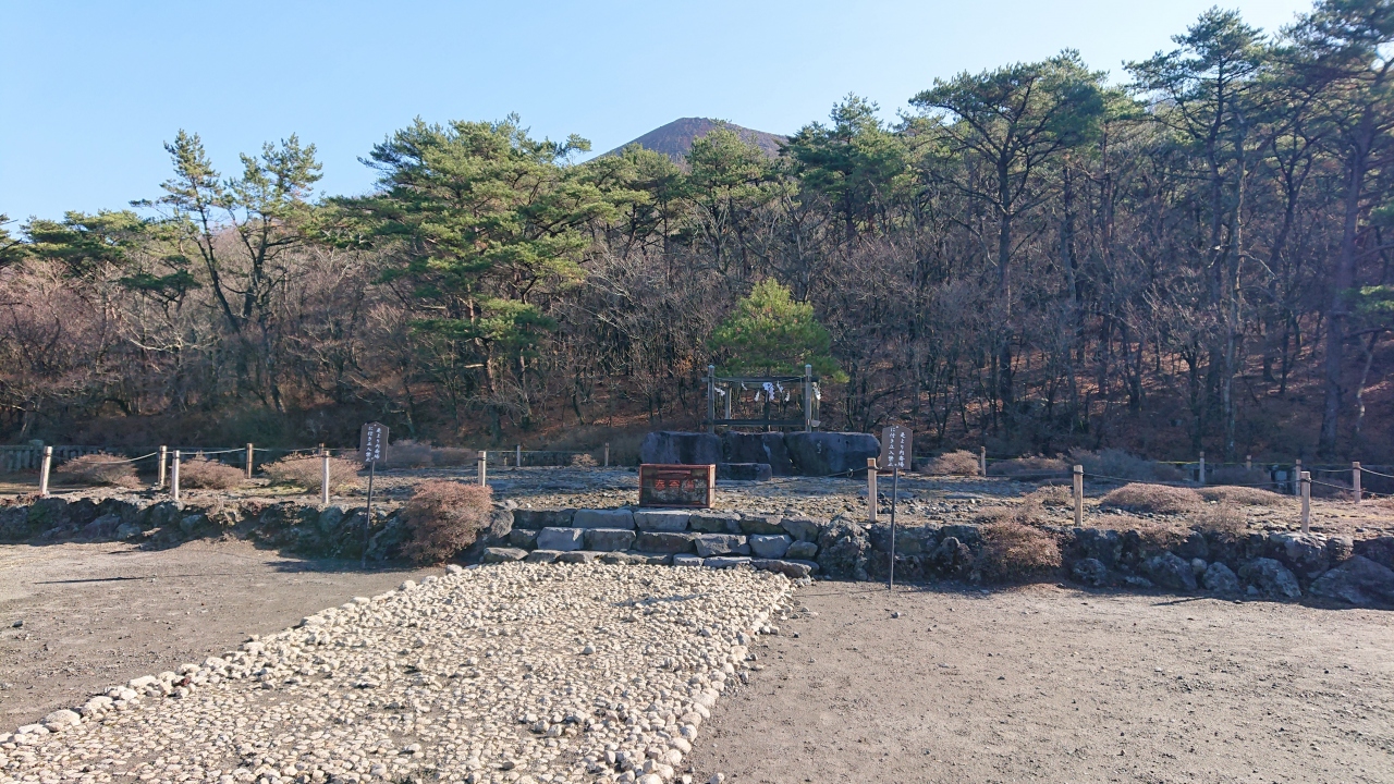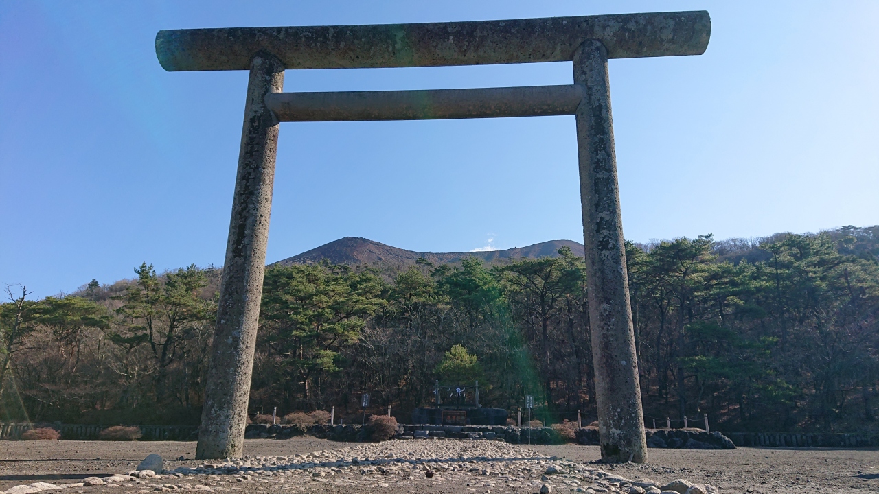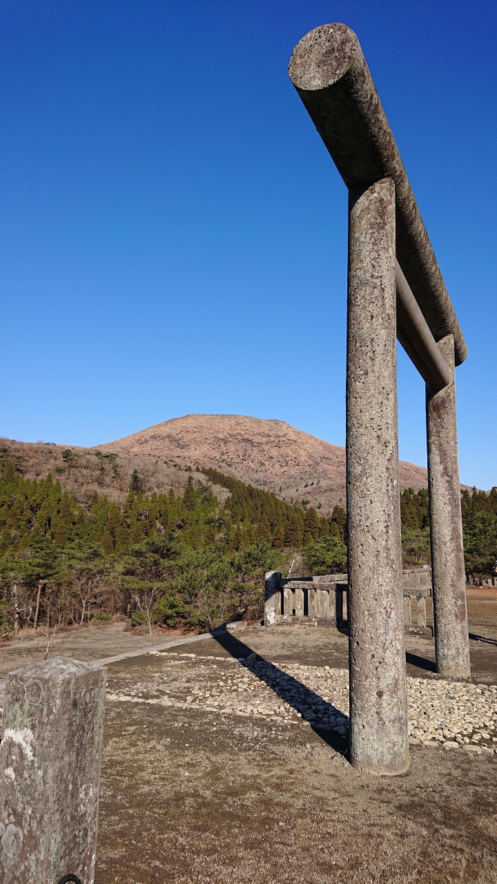 鳥居の背後には御鉢が控えており、神々しくもありました。注連縄で木が一本守られているだけですが、近寄りがたい雰囲気を醸し出しています。現在でも、この地で祭祀は継続されており、11月には天孫降臨御神火祭が斎行されているとのこと。 閉じる投稿日:2020/11/27