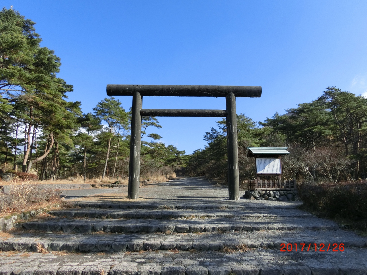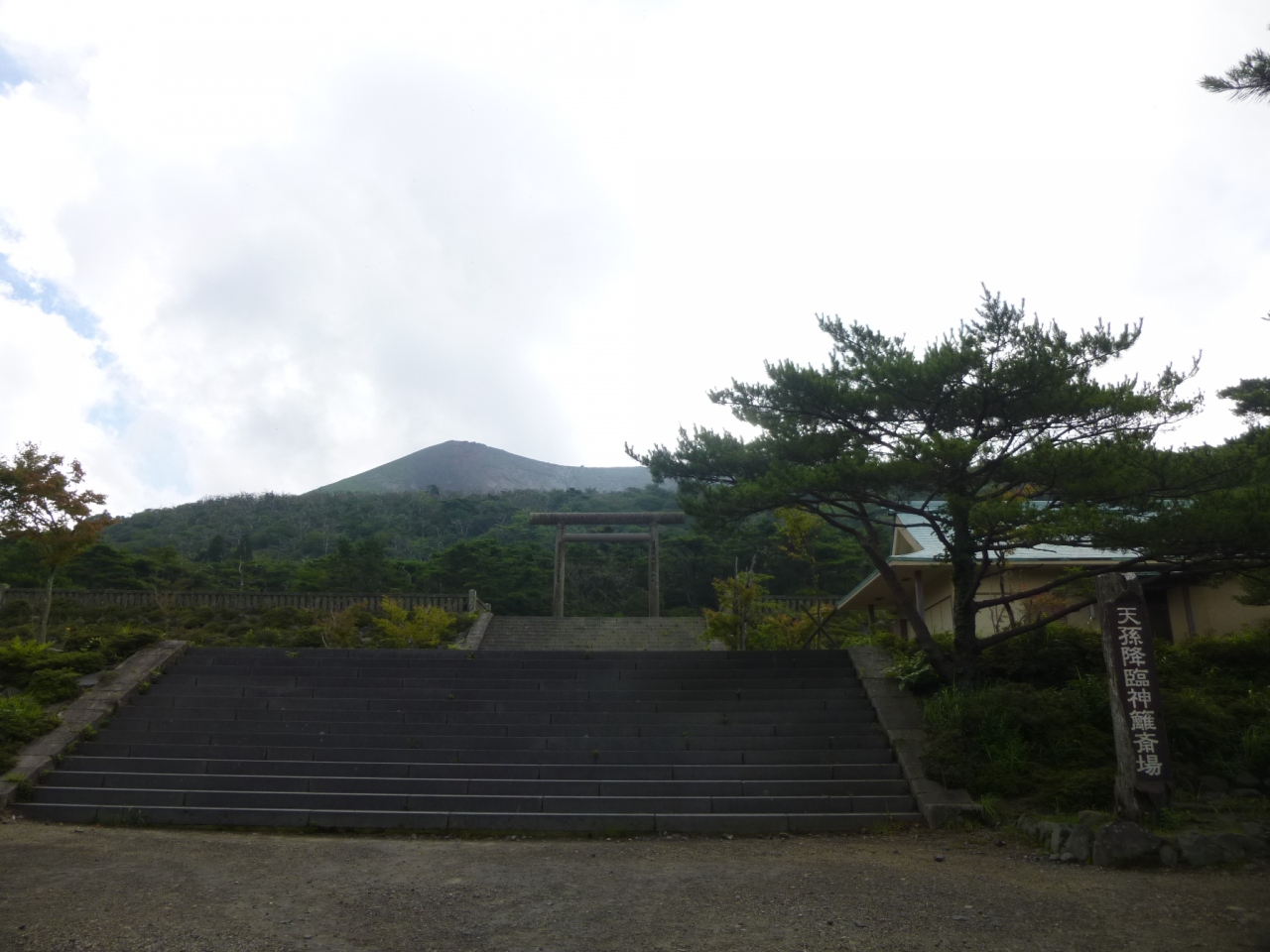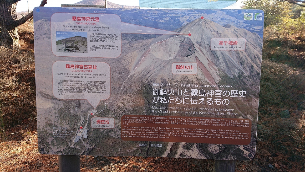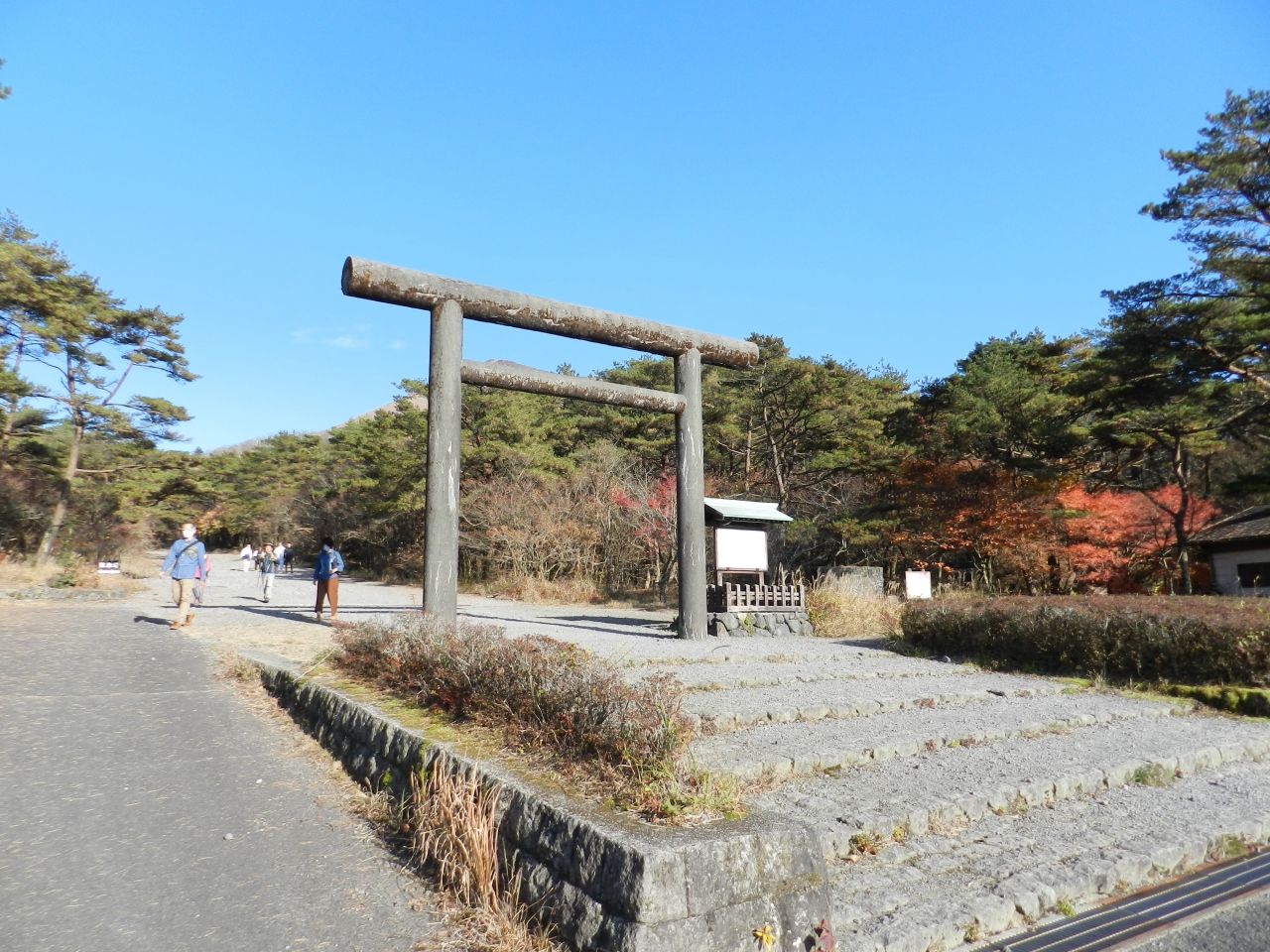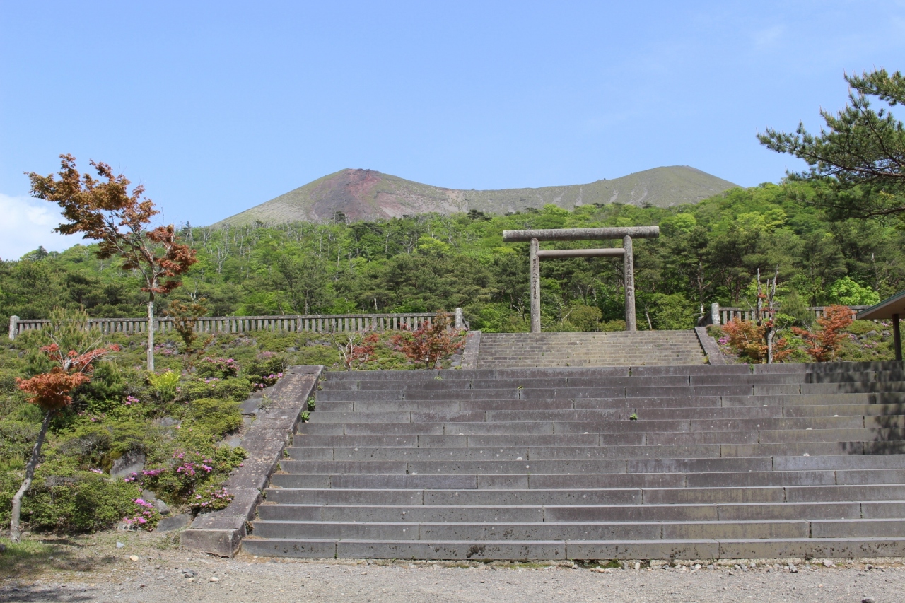 鳥居の背後には御鉢が控えており、神々しくもありました。注連縄で木が一本守られているだけですが、近寄りがたい雰囲気を醸し出しています。現在でも、この地で祭祀は継続されており、11月には天孫降臨御神火祭が斎行されているとのこと。 閉じる投稿日:2020/11/27