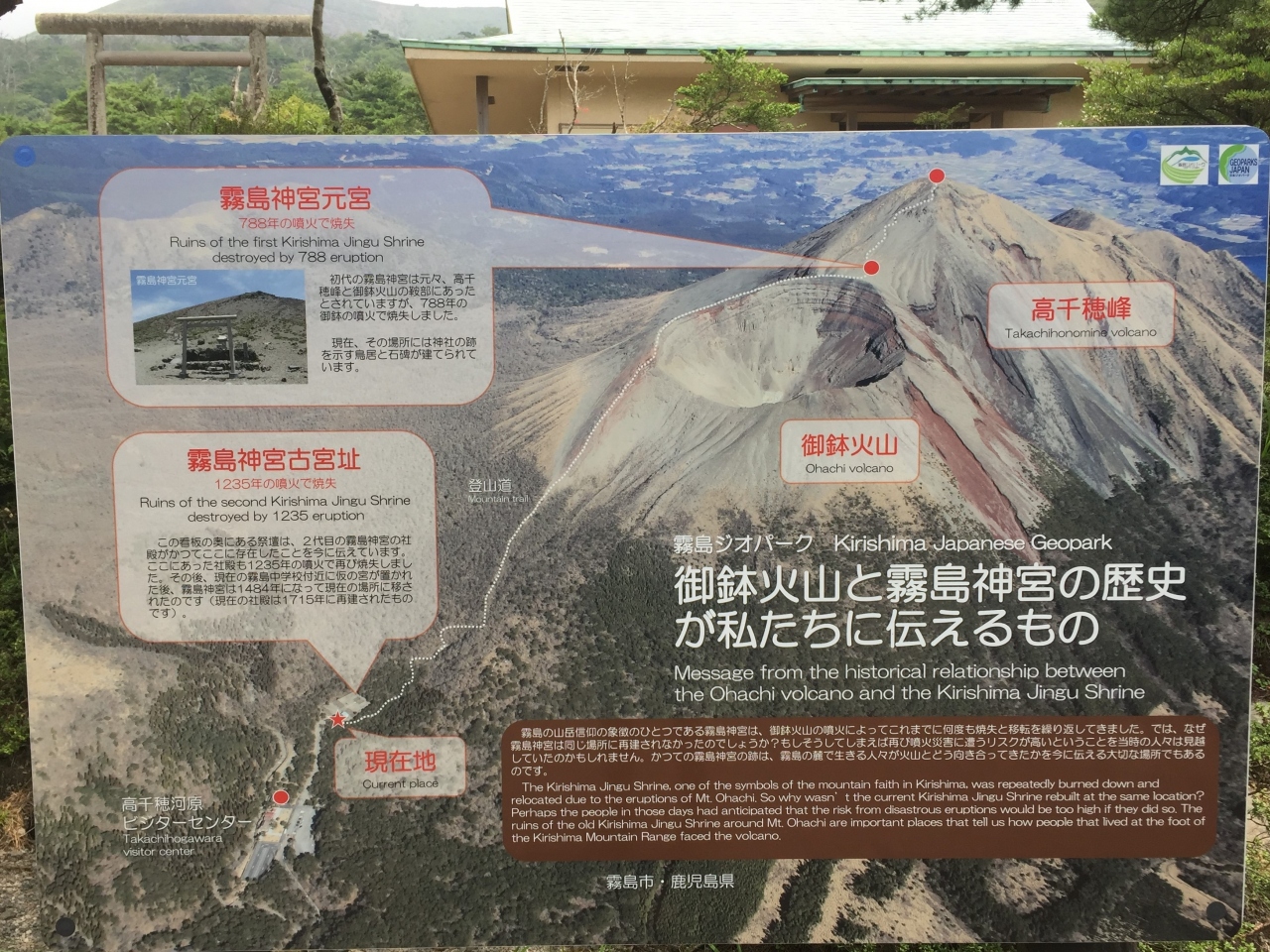 高千穂河原は鹿ヶ原(ミヤマキリシマ群生地として人気)までハイキングに行く人や、高千穂峰、矢岳、竜王山、中岳(途中から立入禁... 続きを読む止)への登山口になっており、車で来た人はビジターセンター前の駐車場を利用します。以前は有人の駐車場入口でしたが、現在は入庫時は自動発券機で受け取り、出庫時に自動精算機で支払う形になりましたので、24時間使用可です。24時間以内は乗用車は500円、バイクは200円。 高千穂河原の駐車場から霧島神宮古宮址には、坂道を5分ほど登ると行けます。独特の空気が流れていることを感じられました。 ビジターセンターは2022年8月リニューアルオープンしました。 閉じる