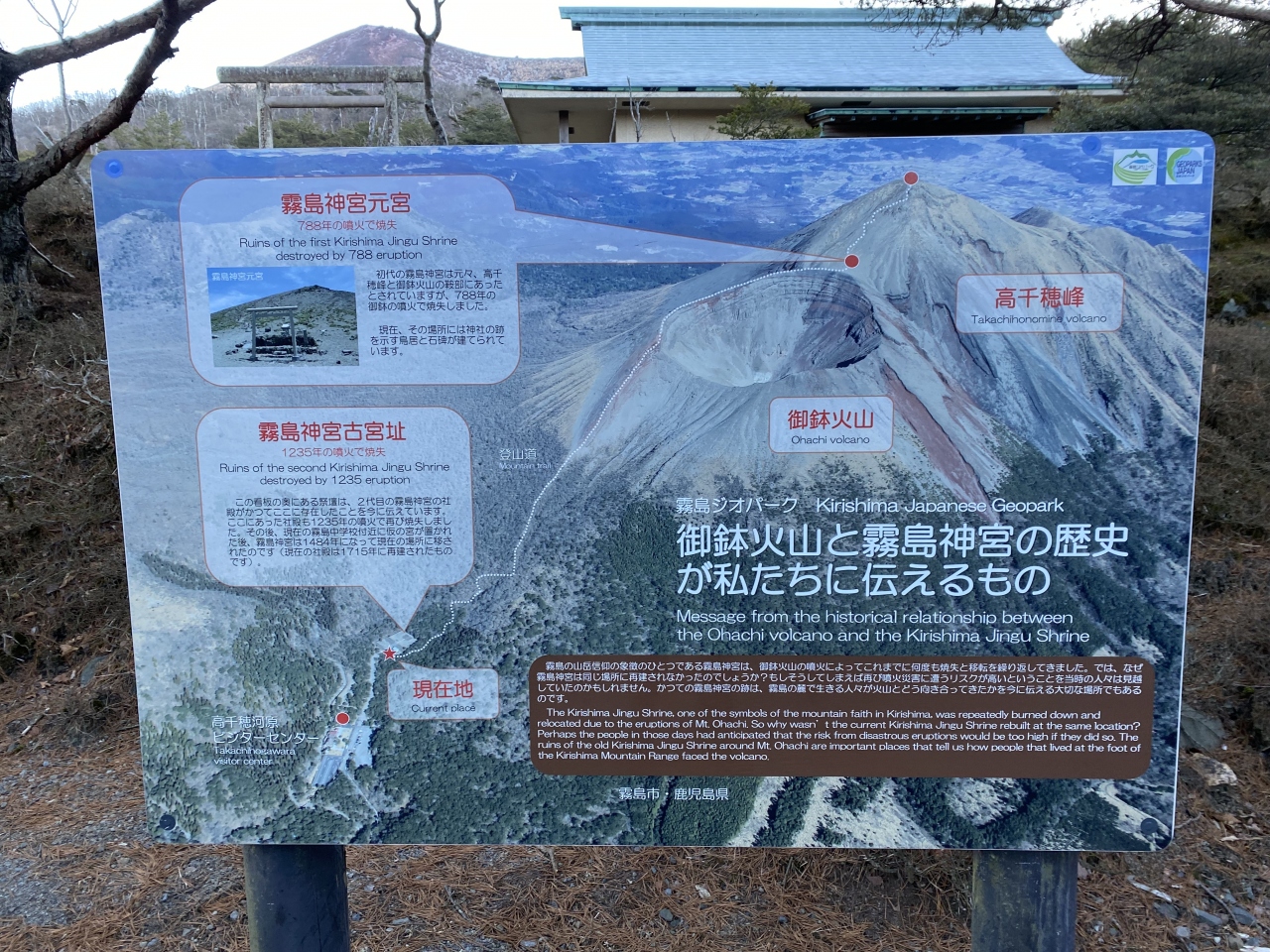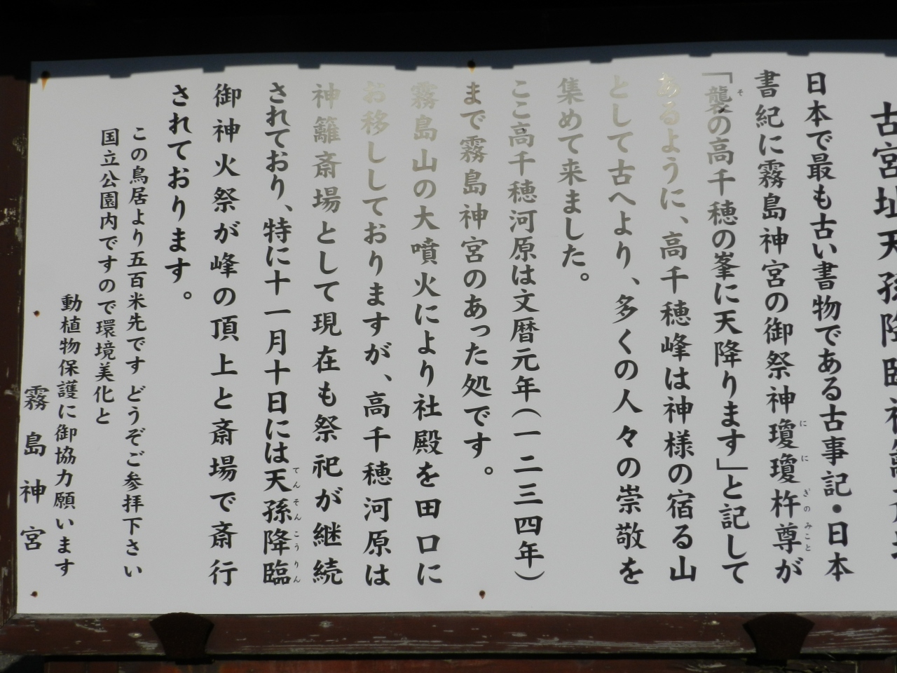 そういう由緒ある場所ですし、背景には高千穂峰が見えるので、天孫降臨の神話伝説に想いを馳せながらお参りするのが良いと思います。