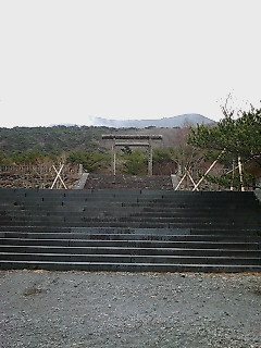 霧島神宮は一番初めは、現在の霧島神宮元宮がある場所(高千穂峰と御鉢の間にある背門丘 <せとお>)に建てられました。それが噴火で焼失したために、この場所に再興されました。それも噴火で焼失し、現在の霧島神宮の場所に再興されました。