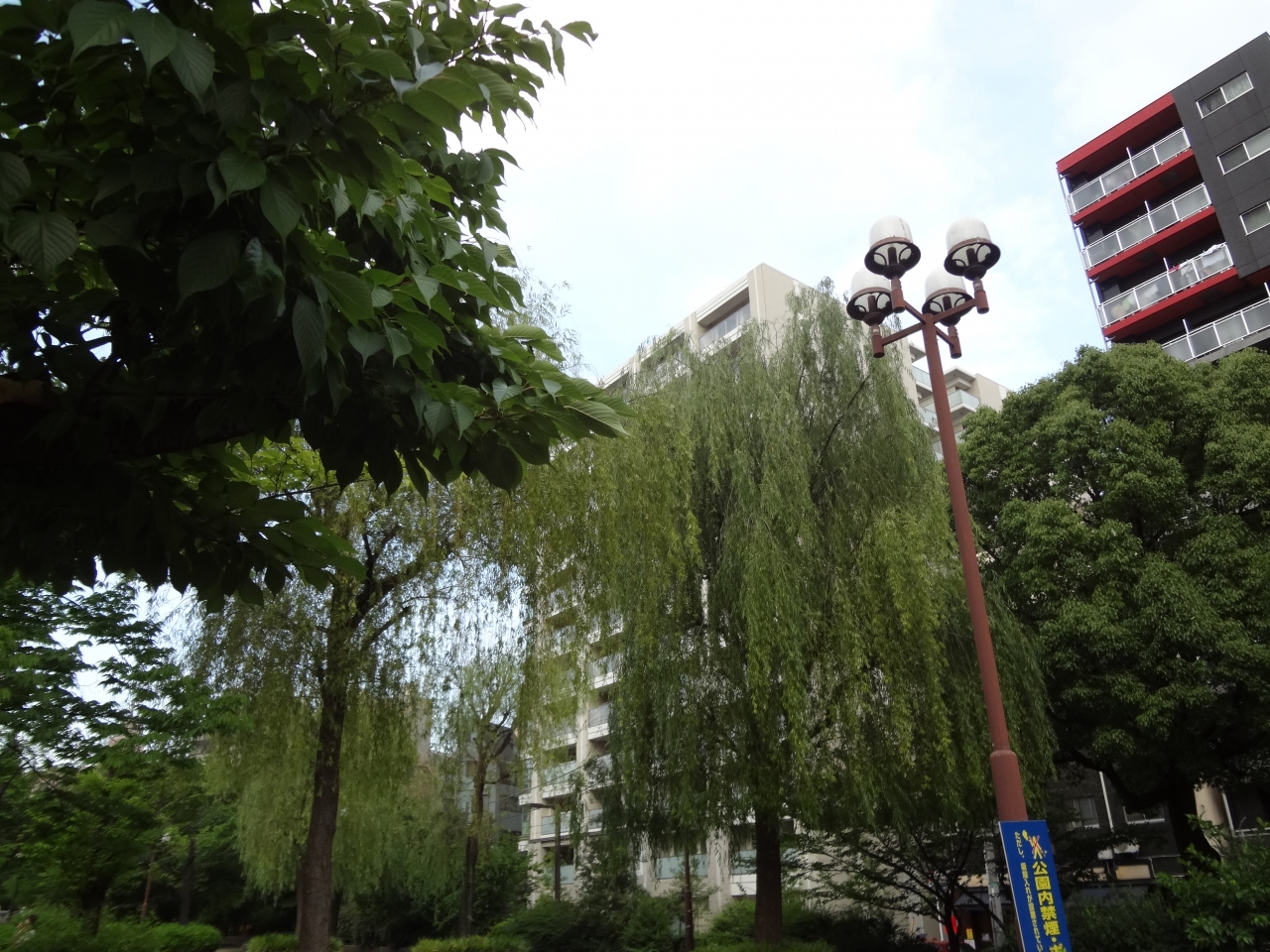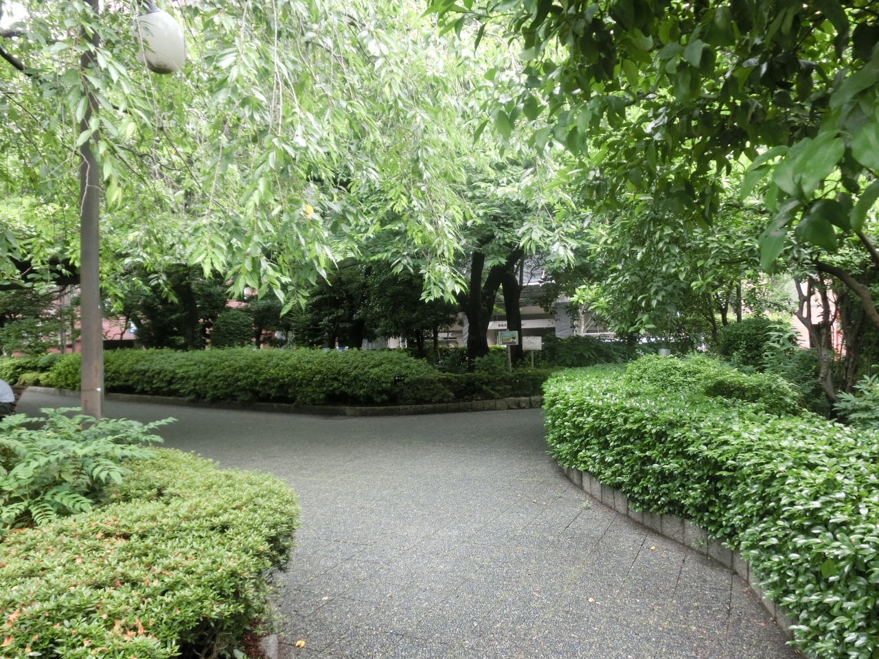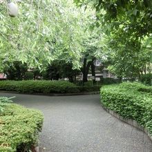 築地川公園の中央の道路です。長く、かつ途中で屈曲しています。