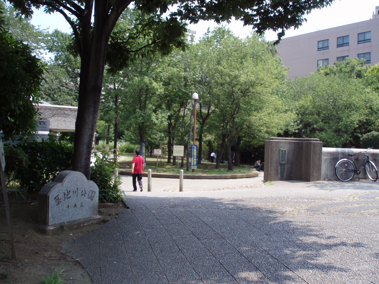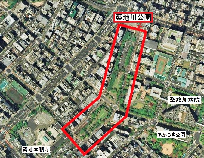 築地川公園の航空写真です。築地川の埋め立ての跡地の一部です。