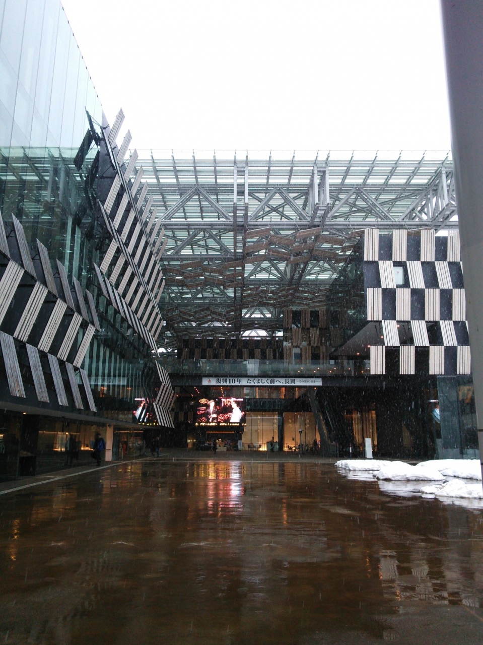 ガラス張りの造りに木と和の塗装を組み合わせたJR長岡駅前の公共施設