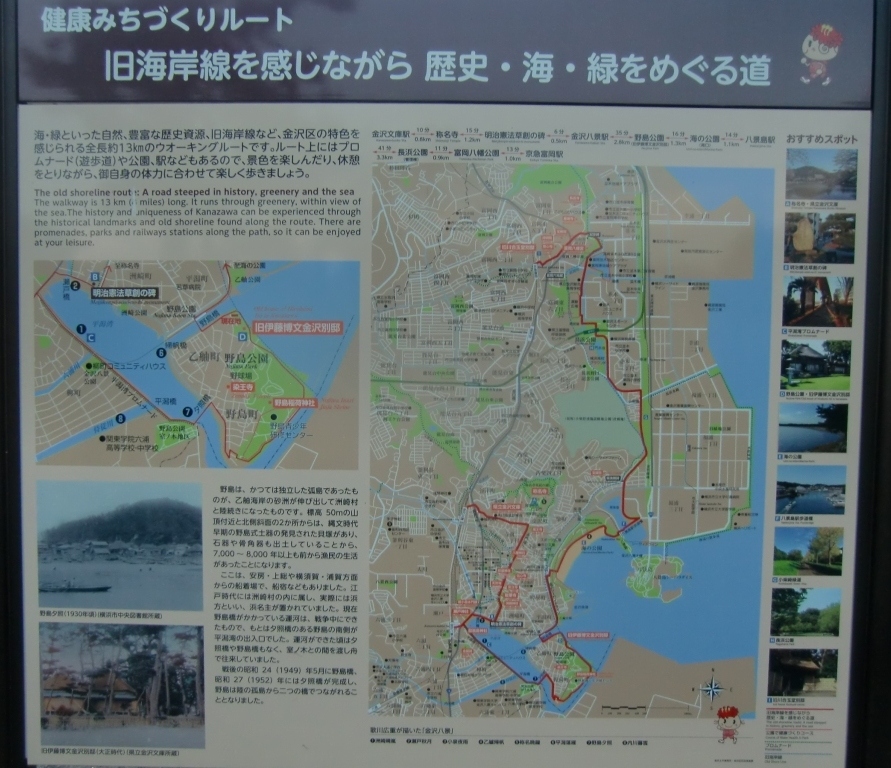 整備と言えば横浜市で唯一とされる野島海岸の横須賀市との境界の水路に、湾岸線延伸工事のための地盤調査と思われるパイプ組みの櫓が出現している。浅利などの貝や蟹などのすみかで水鳥が戯れる環境の保護、横須賀市側の利便性向上のため夏島方面へのルート変更など都市計画の見直しが期待される。旧博文別邸と貧相な高架道路景観は合わない。