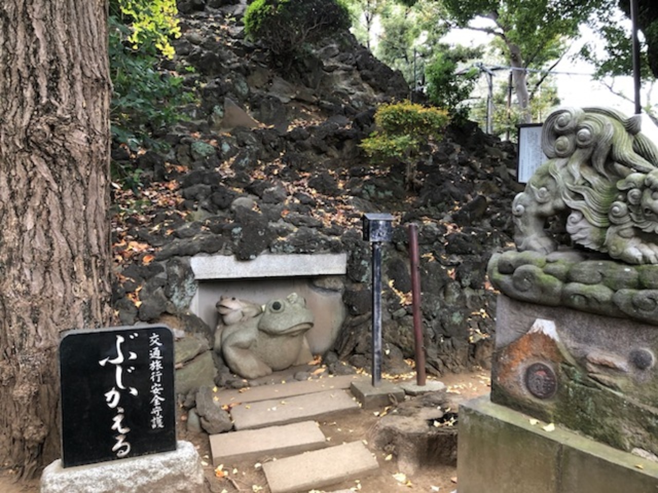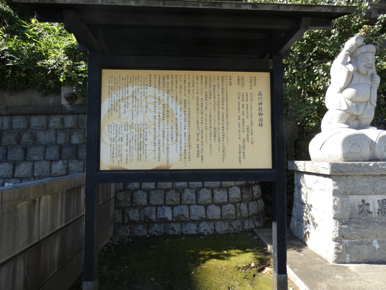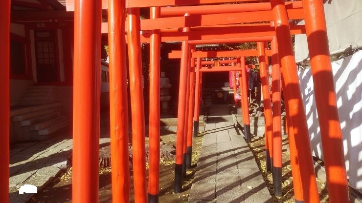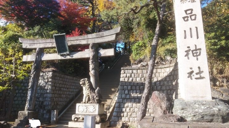 参道は第一京浜(東海道)から西向きに53段の石段となっています。鳥居には登り龍と降り龍が彫られており「双龍鳥居」というそうです。鳥居の隣には、東海七福神の大黒様が鎮座していました。石段を登ると、参道はそのまま真っすぐ、社殿は東向き。朱塗りで比較的新しく感じました。拝殿に向かって右側にある赤い鳥居が連なる阿那稲荷神社には、金運UPで有名な「一粒萬倍の泉」があります。また、両神社の間の道を通って先に進むと、板垣退助のお墓があります。ちなみに、第一京浜の東側200m程には、旧東海道が走っており、品川宿だった場所です。そのため、品川宿の鎮守としても信仰されているそうです。
