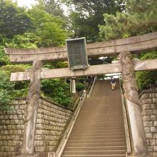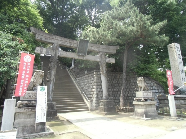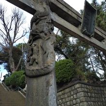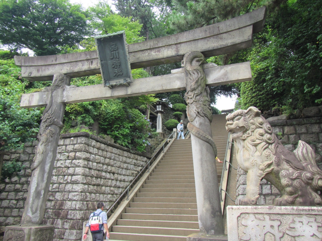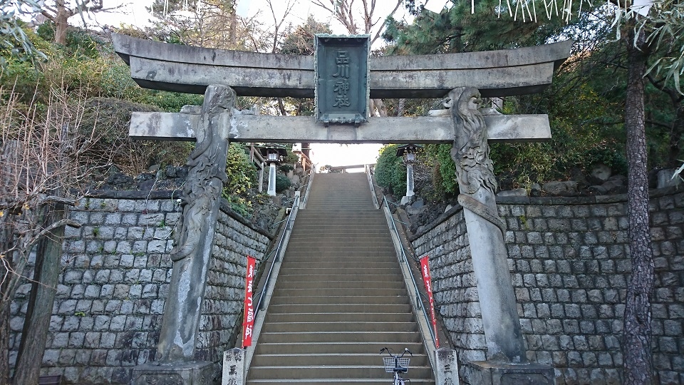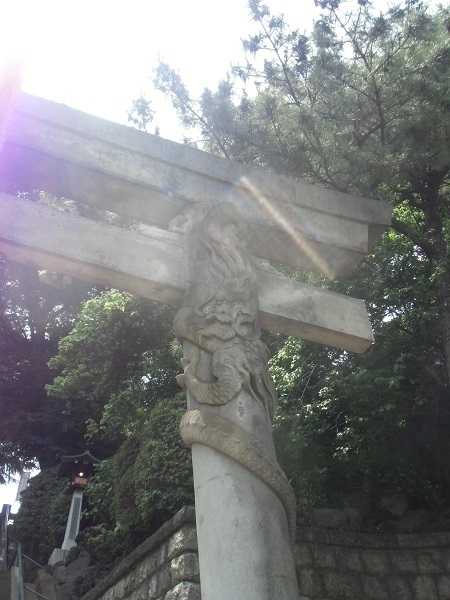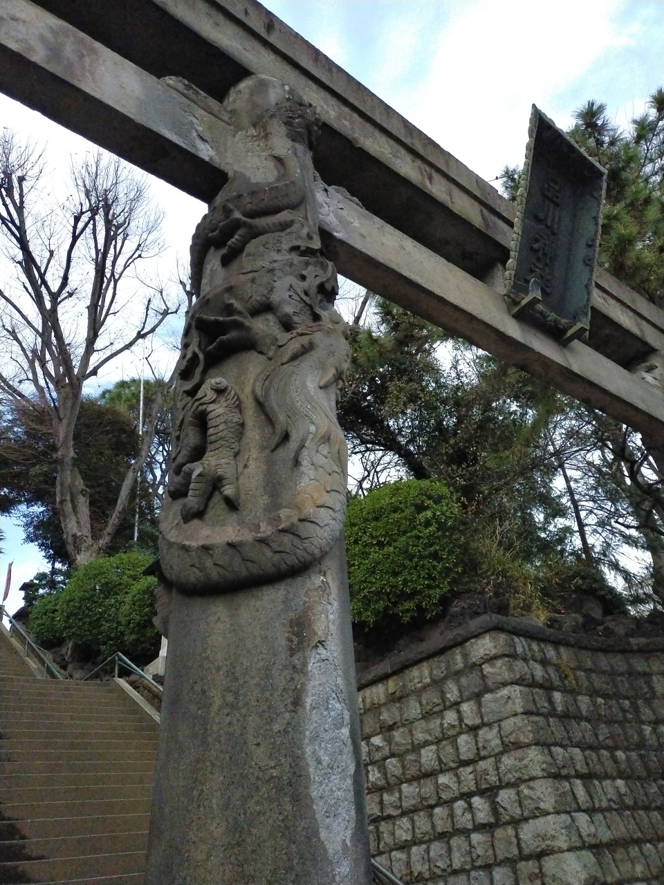 国道15号線(第一京浜)側の参道には一対の龍が絡み付いている大きな石鳥居が有りここを潜り長い石段を登っていきます。