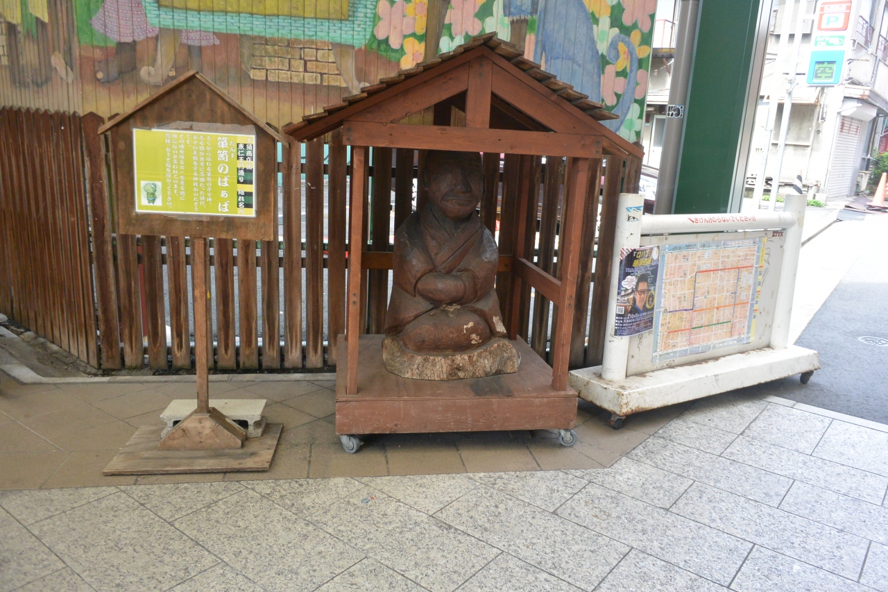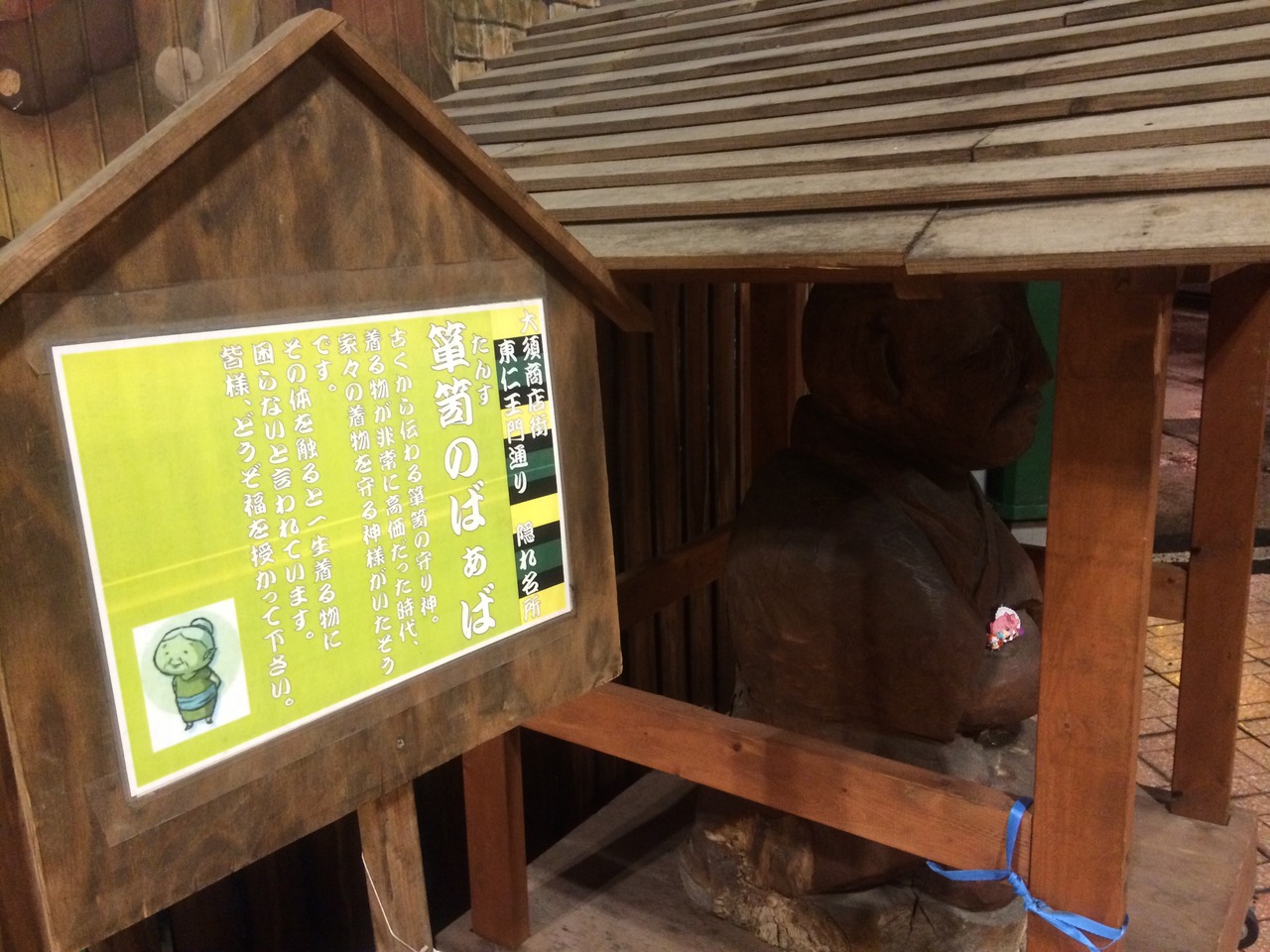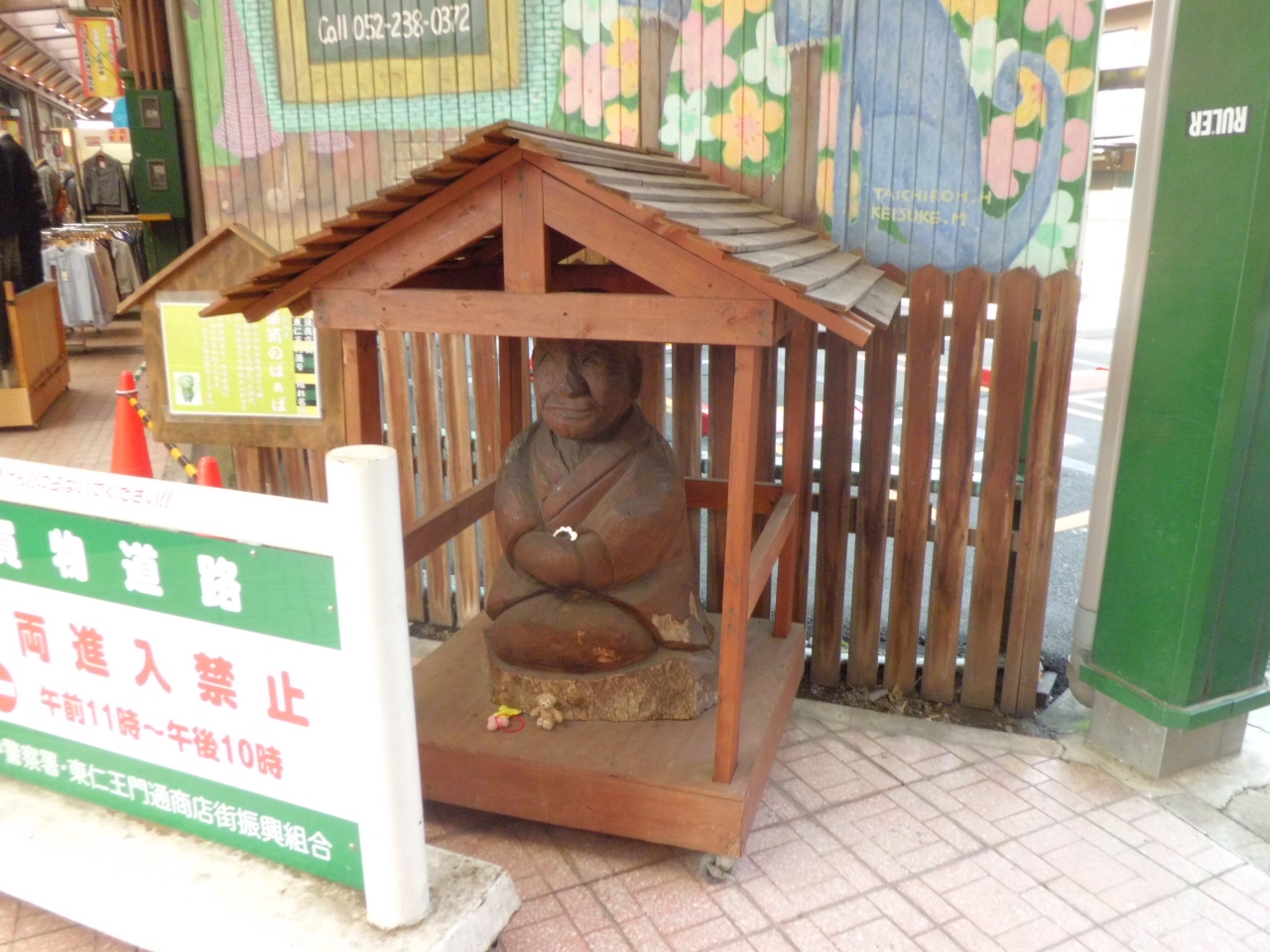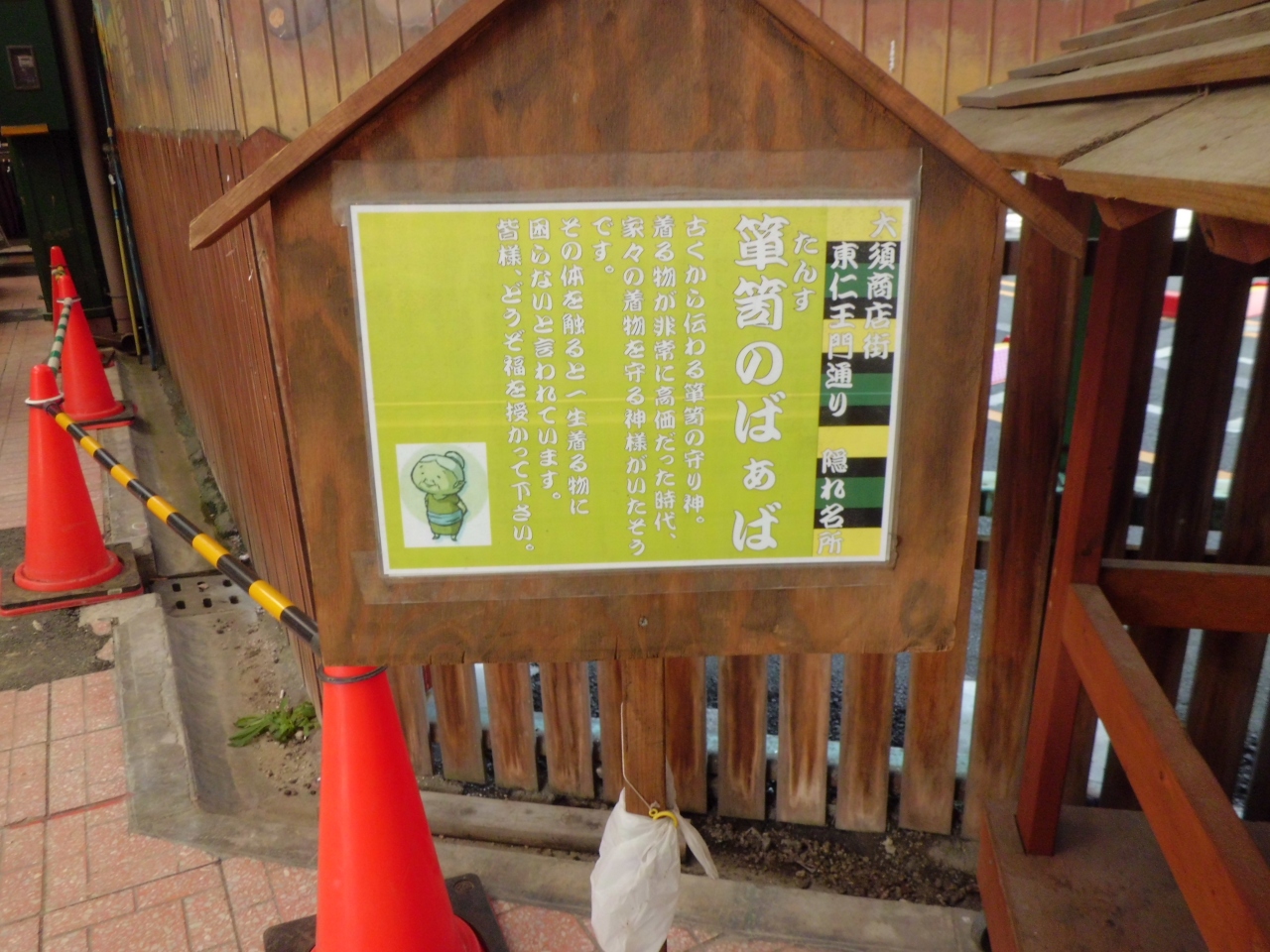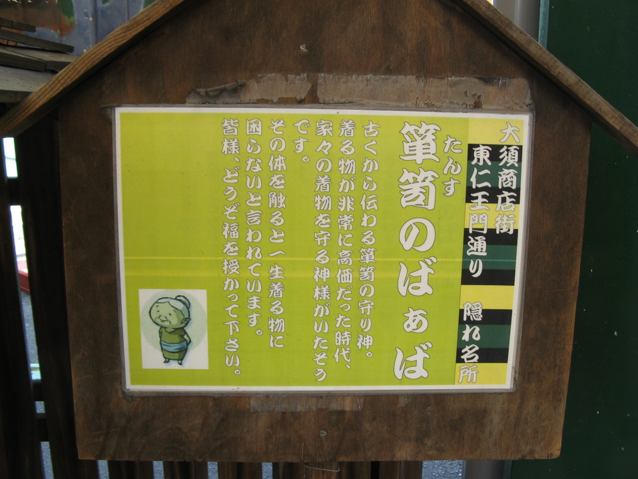 商店街のなかにある箪笥の守り神 前に道路標示が置かれてました