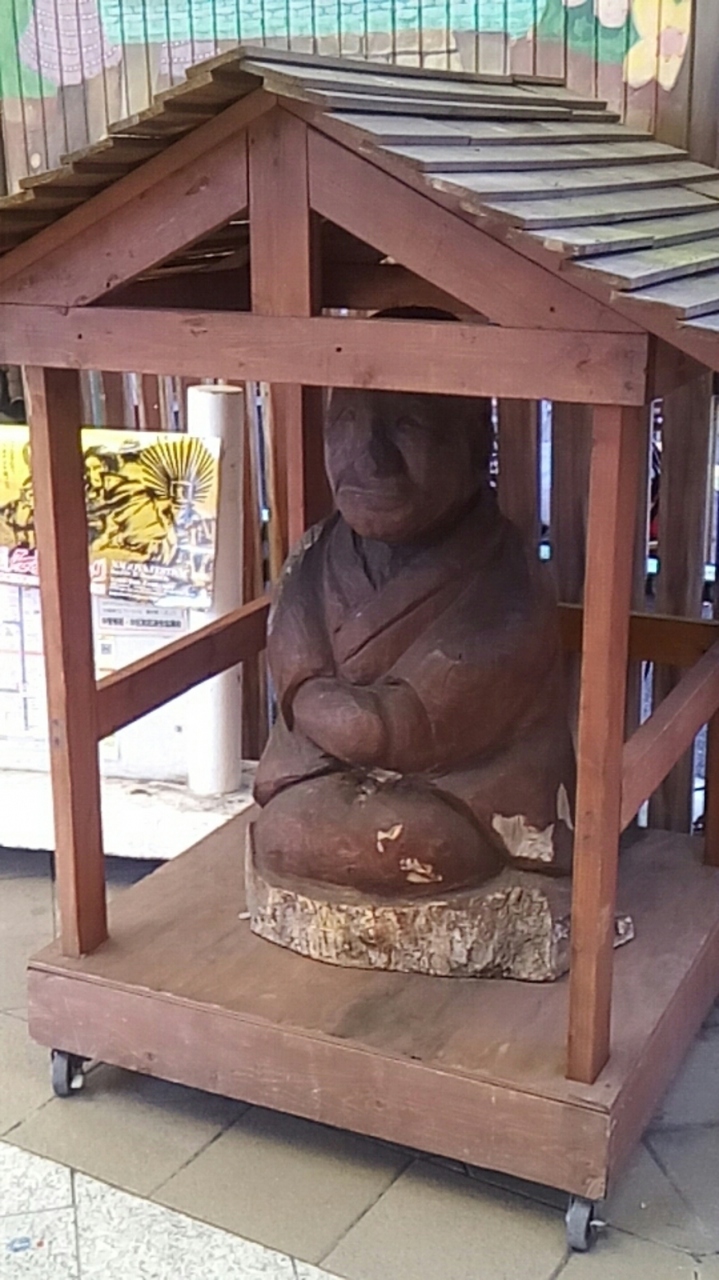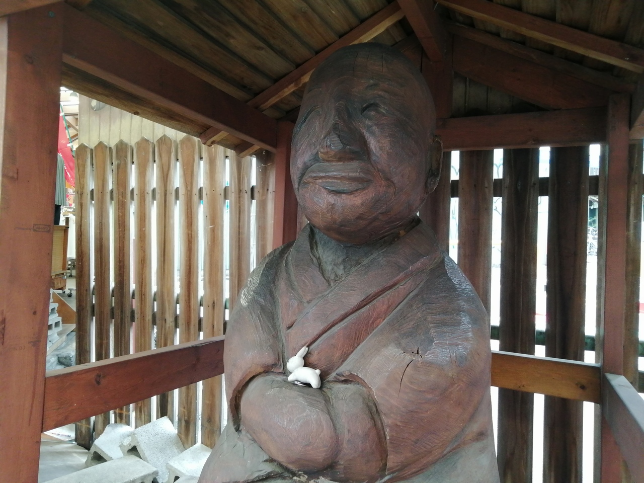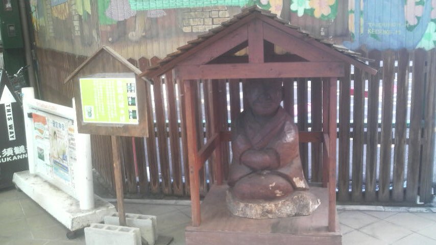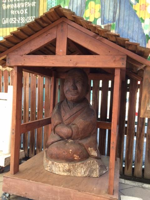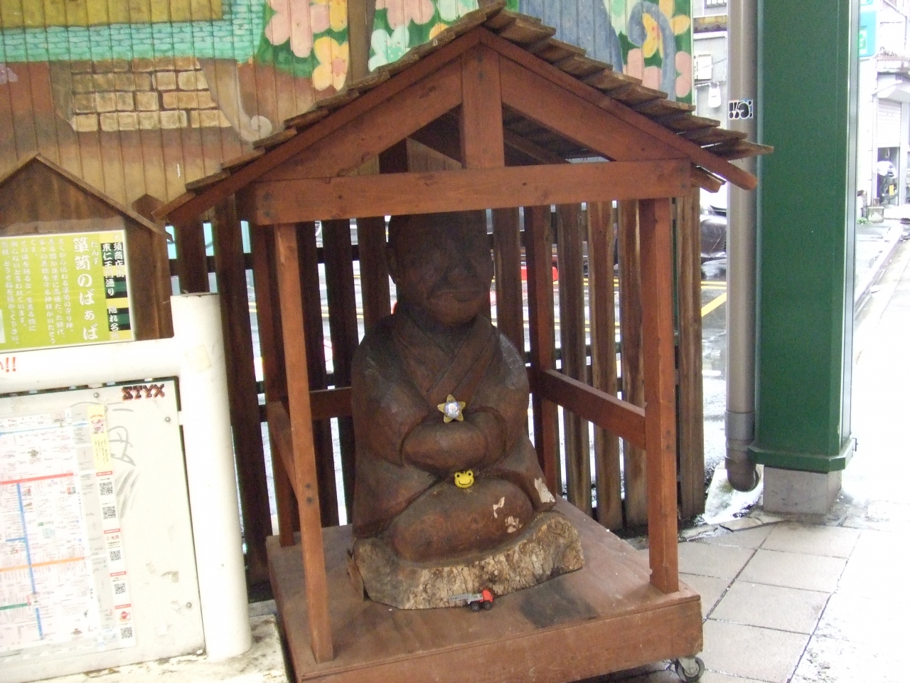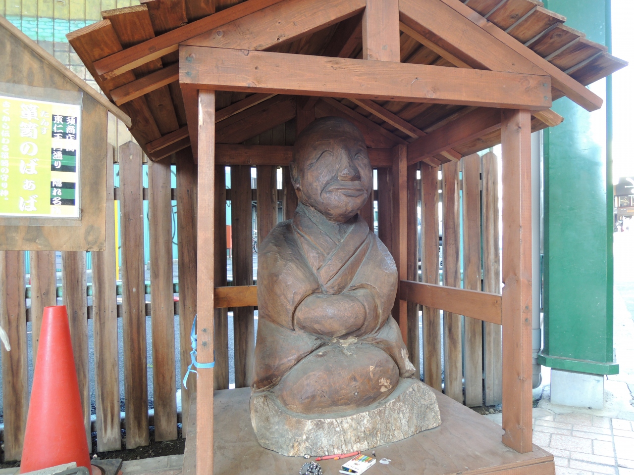 商店街のなかにある箪笥の守り神 前に道路標示が置かれてました