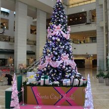 5層吹き抜けのアトリウムにピンク色のクリスマスツリー