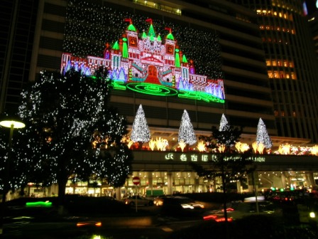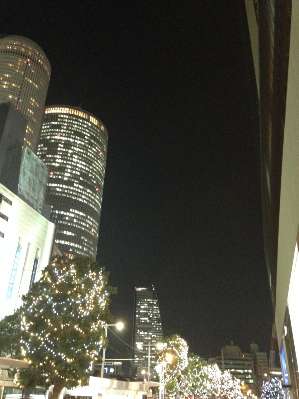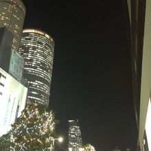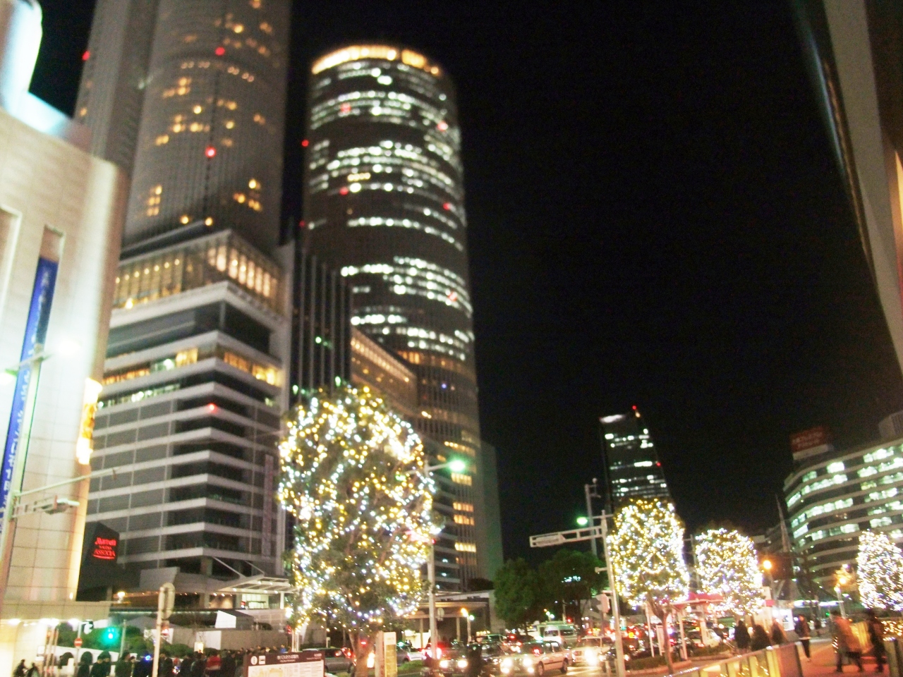 名古屋駅前 ビルごとのイルミネーションが彩りを加えます