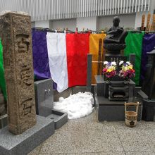 建物の入口の玄関の周りには、石碑、石像等が並べられています。