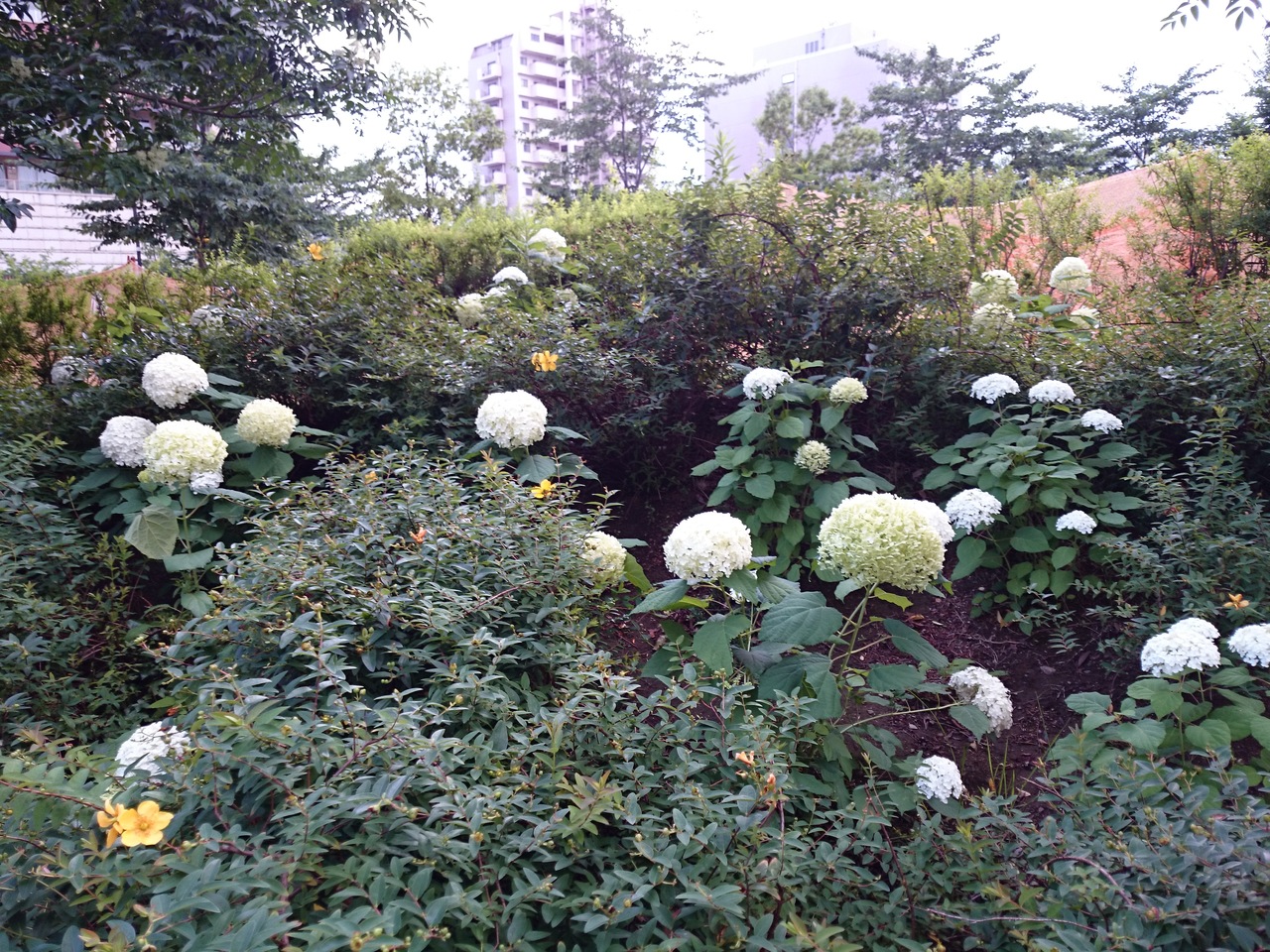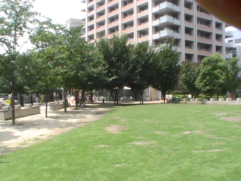 この公園内な、自由に入ることができる芝生の広場があり、子供連れのファミリーが遊んでいます。