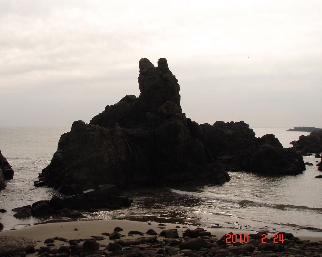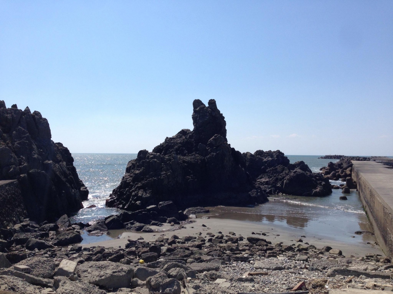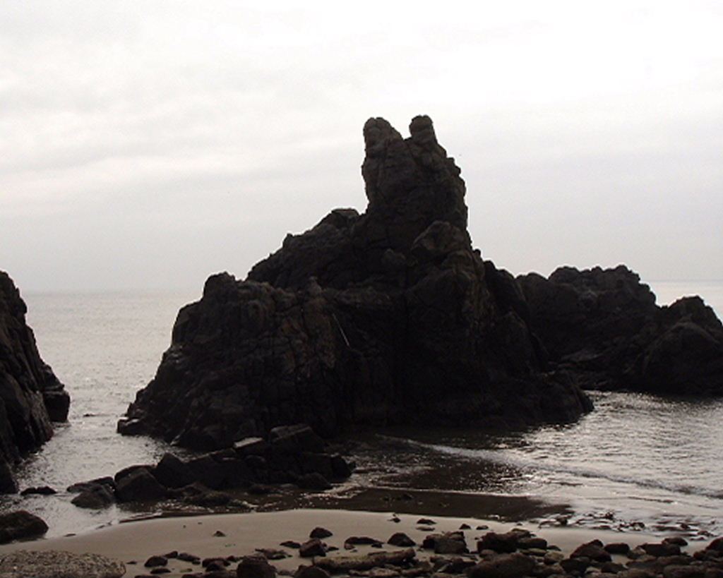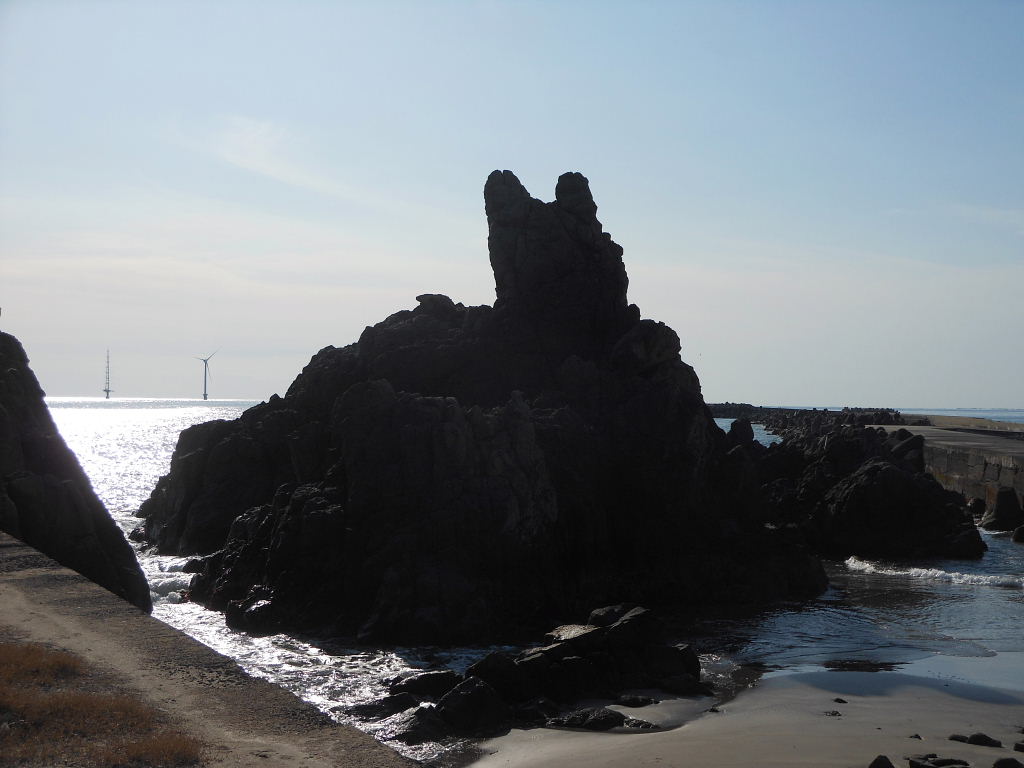 逆光で撮影すると、シルエットが犬のお座りの形に見えますが、これが大自然の波による浸食でできたとは思えないような見事なものです。