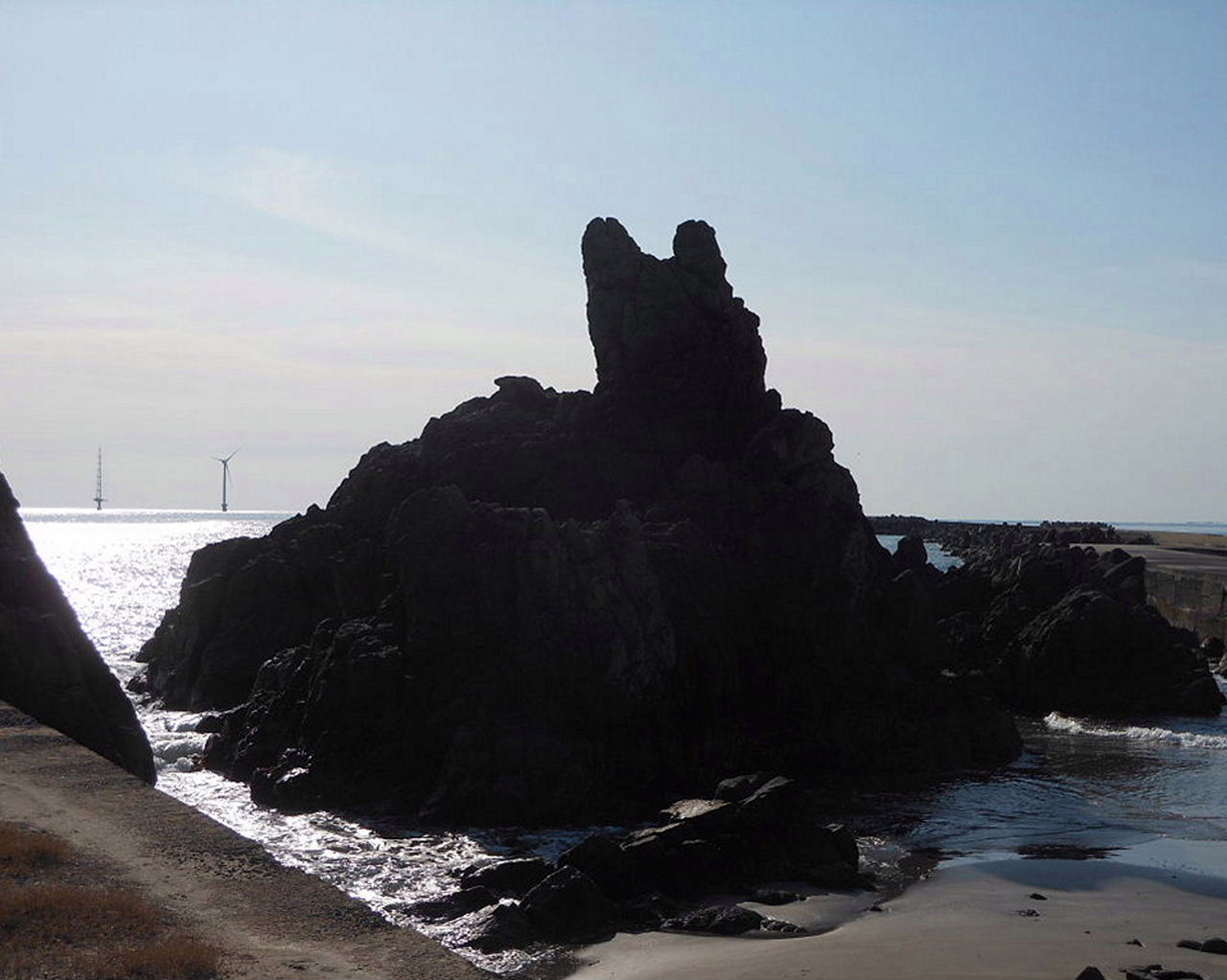 犬岩は、源義経にまつわる伝説の一つで、追いつめられた義経が千騎ケ岩に立てこもった後、犬吠埼から舟で北上しましたが、とり残された愛犬若丸が7日7晩鳴き叫び8日目にその姿は海の中の岩となったとの伝説です。