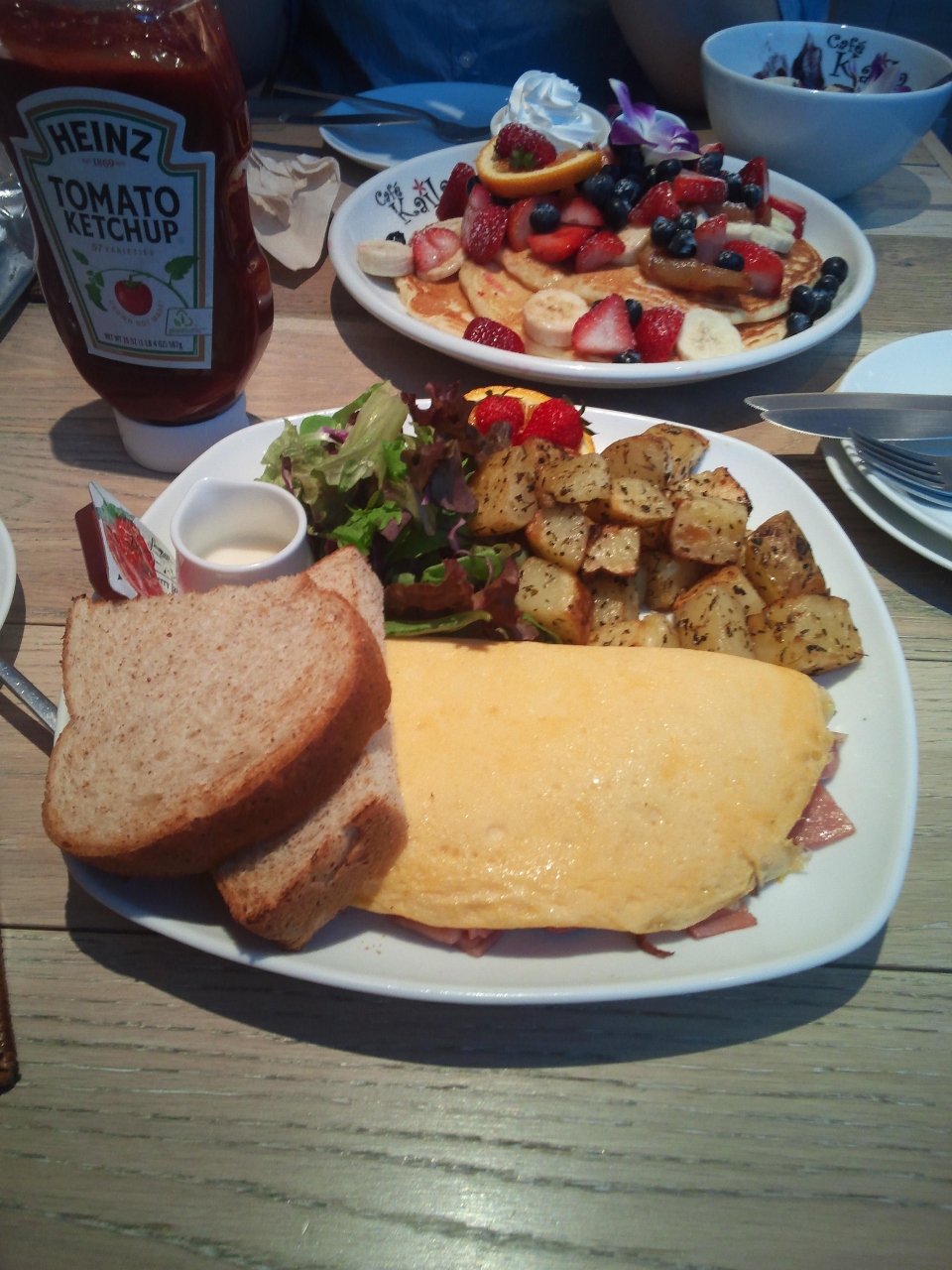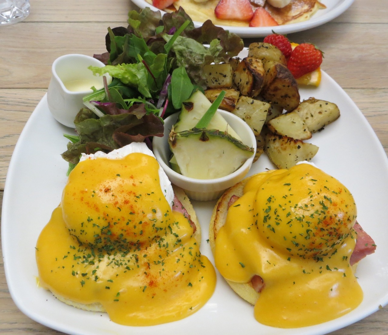 定番のフルーツたっぷりのオリジナルパンケーキと60食限定のエッグベネディクトを娘とシェア。ボリュームがあるのは承知の上ですが、両方食べたくて朝食抜きで挑みました(≧∇≦)