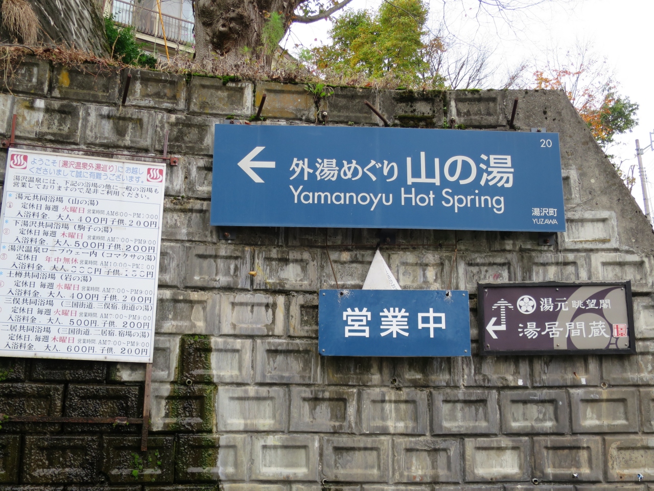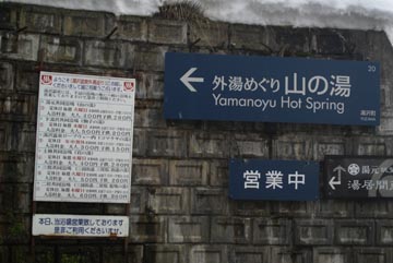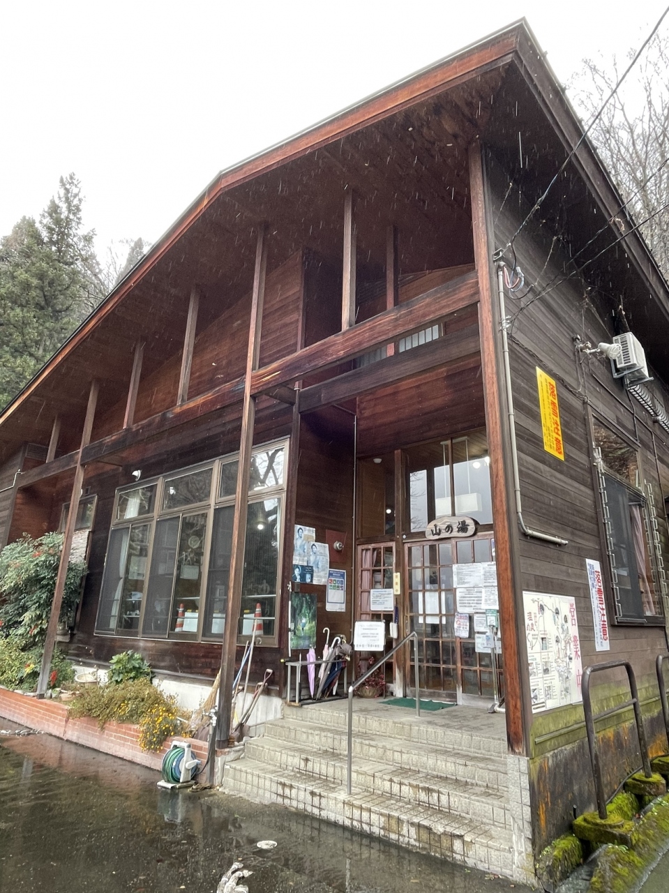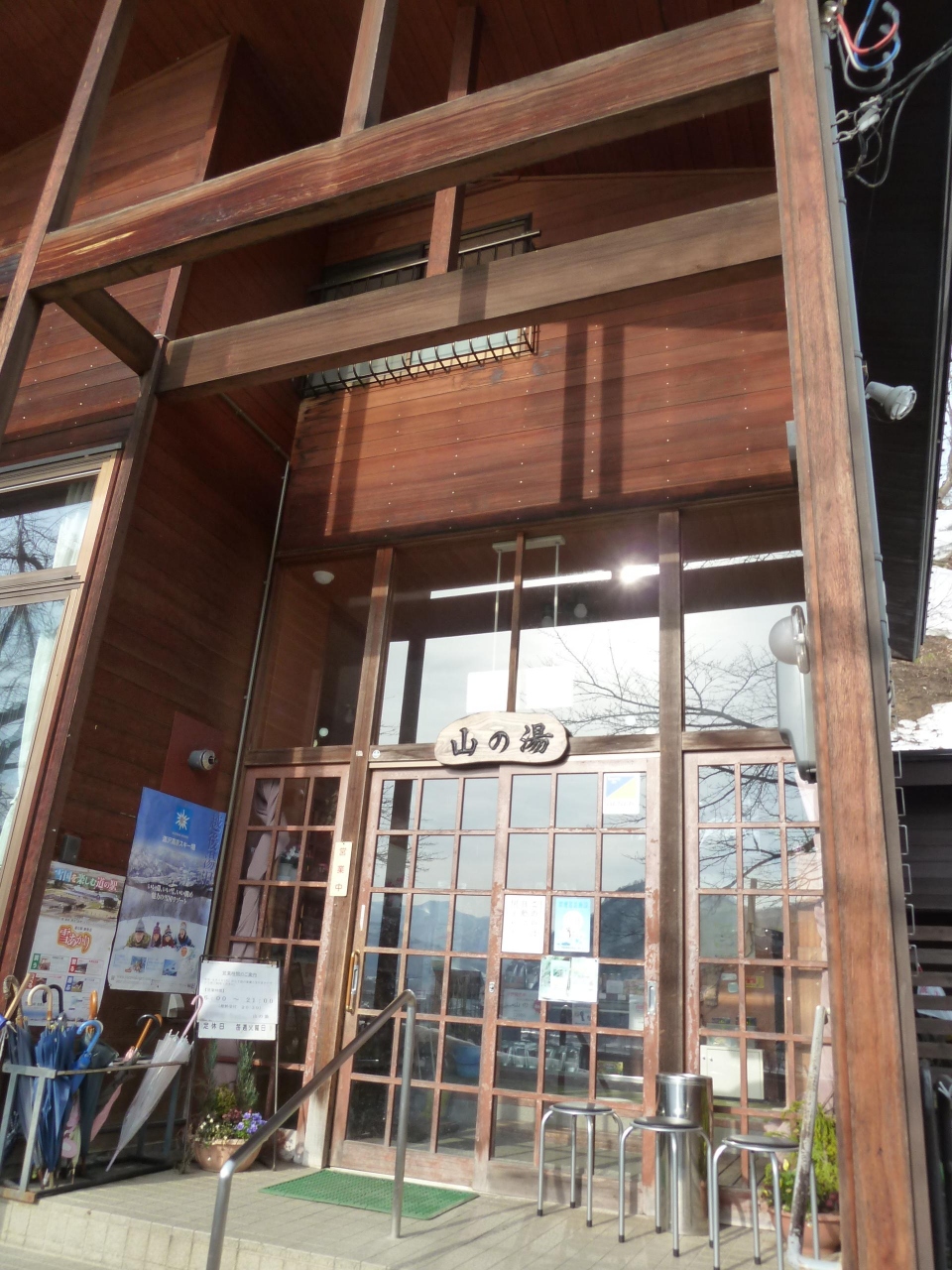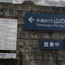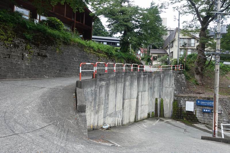 ガーラ湯沢駅の近くにあることは、地図を調べて分かっていましたが、歩いてどのぐらい時間がかかるか分かりません。駅の大きなビルを出て、新幹線の高架をくぐって、その先のトンネルを抜けると山の湯の看板があり、融雪用の水が流れる階段を登ると、山の湯の入口に10分ぐらいで着きました。
