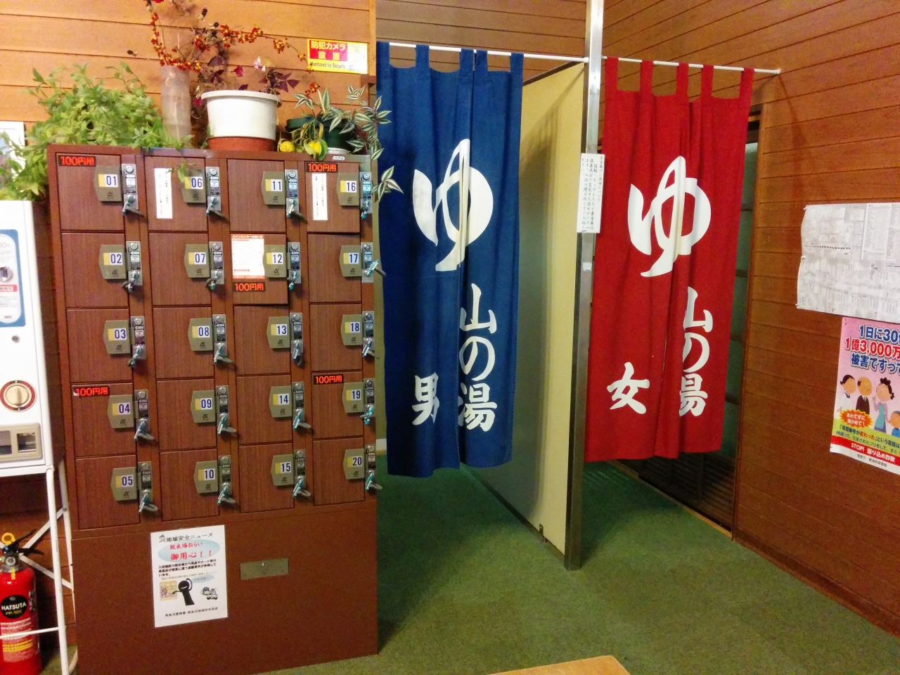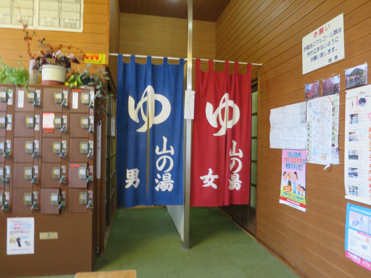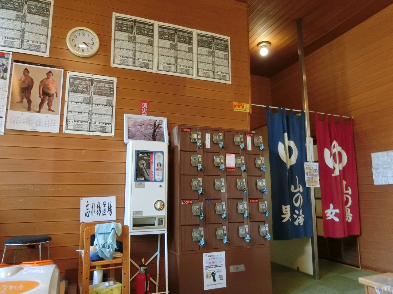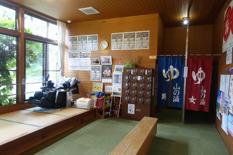 脱衣所は棚しかないので、貴重品は持って行かないか、もしくは入口の手前にあるロッカー(有料100円)に入れます。露天はなく内風呂が一つあるのみ。ボディーソープとリンスインシャンプーが置いてありますが、シャワーがないので桶に蛇口からお湯と水を混ぜて使うといった感じになります。ドライヤーは脱衣所に置いてありました。