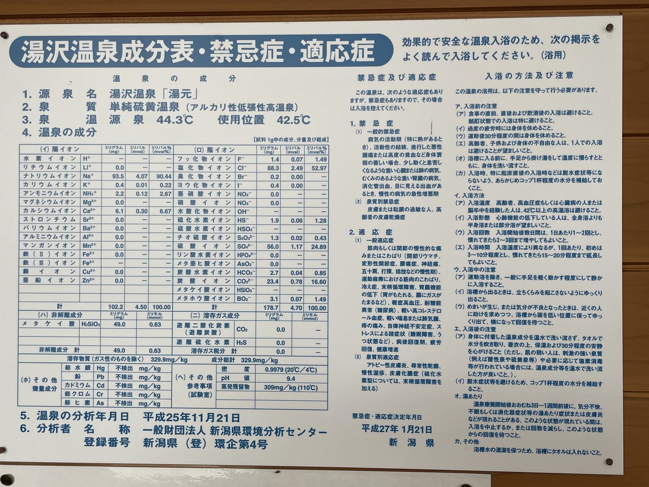 泉質は単純硫黄泉。無色透明で少し硫黄のにおいを感じます。加水、加温、循環等をしておらず、かけ流しの温泉を堪能できました。浴室内に「夏季は源泉温度が高くなることがある」との表示が出ていましたが、誰でも入れるちょうど良い湯温でした。越後湯沢にある5つの外湯のうち、ここだけがかけ流しなので一番のおすすめです。