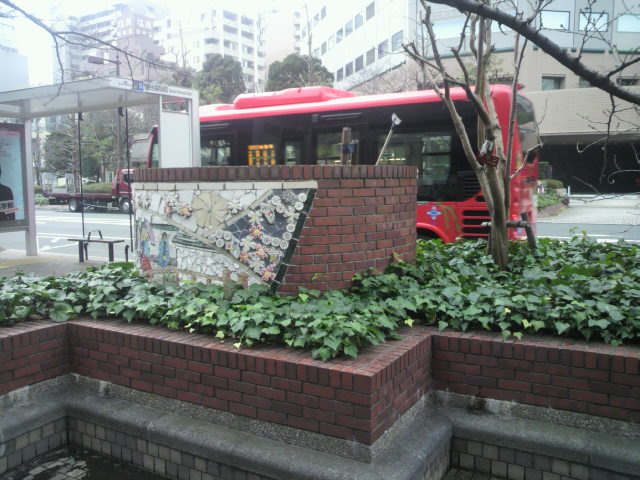 バス停横の運上所のタイル絵の石碑の前に停車しているバスです。