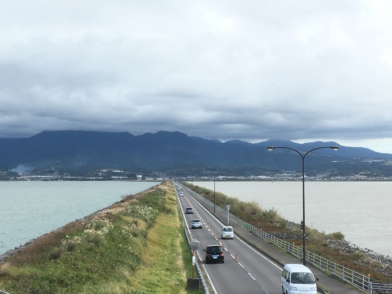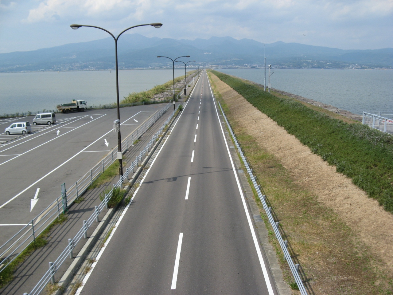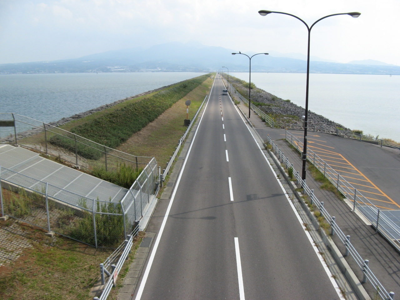 九州一周旅行のときに、島原から長崎に行く途中「雲仙多良シーライン」を通りました。場所は、島原半島の吾妻町から高来町を結ぶ道... 続きを読む路です。ここは、諫早湾の堤防閉め切りで構築した、潮受堤防の上に建設した全長約8kmの堤防道路で平成19年12月に開通しました。一般には“諫早湾干拓堤防道路”と呼ばれているようです。