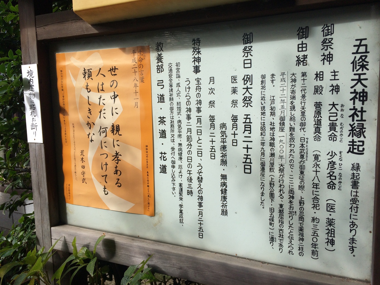 五條天神社は、日本武尊が、東征のおりに大己貴... 続きを読む命と少彦名命を、上野忍が岡に祀ったものとされ、当時の天神山(現在の摺鉢山)や瀬川屋敷(現在のアメヤ横丁入口)など、幾度か社地を転々とした後、昭和3年に創祀の地に最も近い現在地に遷座されたとのことです。五條天神社に、併せて祀られている相殿の菅原道真公は、江戸時代に入り寛永18年に、合祀されたと言われています。