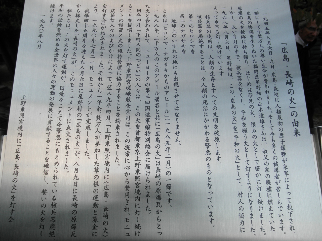 そこで検索してみると、『上野の森に「長... 続きを読む崎 広島の火」を永遠に灯す会』という組織があり、「「同年(1998年)4月「下町人間の会」の人々は、この火を東京上野の東照宮境内に灯し続けることを提唱。嵯峨敞全宮司の大きな賛同のもと、モニュメントの設置と火の維持管理のご協力がいただけることになりました。」という経過があり、「1990年、被爆45周年の8月6日、星野村の「広島の火」と長崎原爆瓦から採火した「長崎の火」が「広島・長崎の火」としてモニュメントに点火されました。」ということだ。