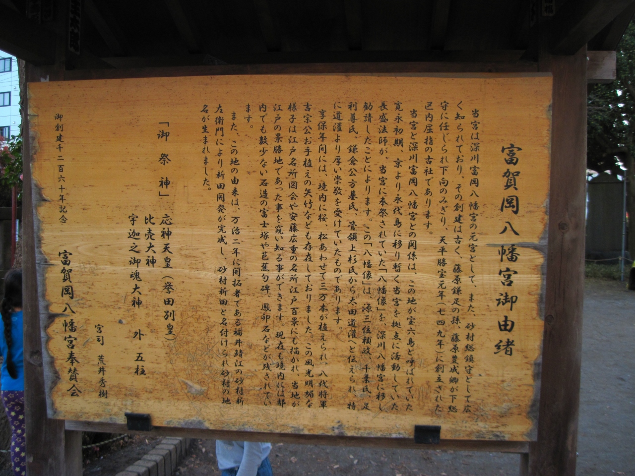 深川の八幡宮の元宮と云う説もあり、境内には「元八幡旧跡」という石碑があります。