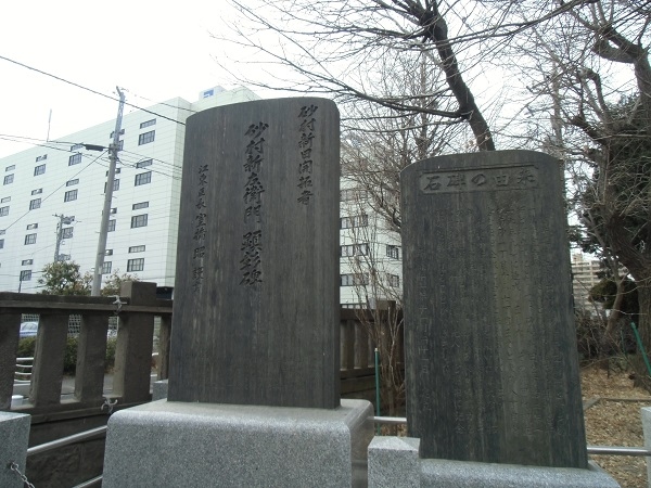 参道の入り口左手には石碑が2基あり、左側には「砂村新田開拓者 砂村新左衛門顕彰碑」、右側には「石碑の由来」と刻まれています。