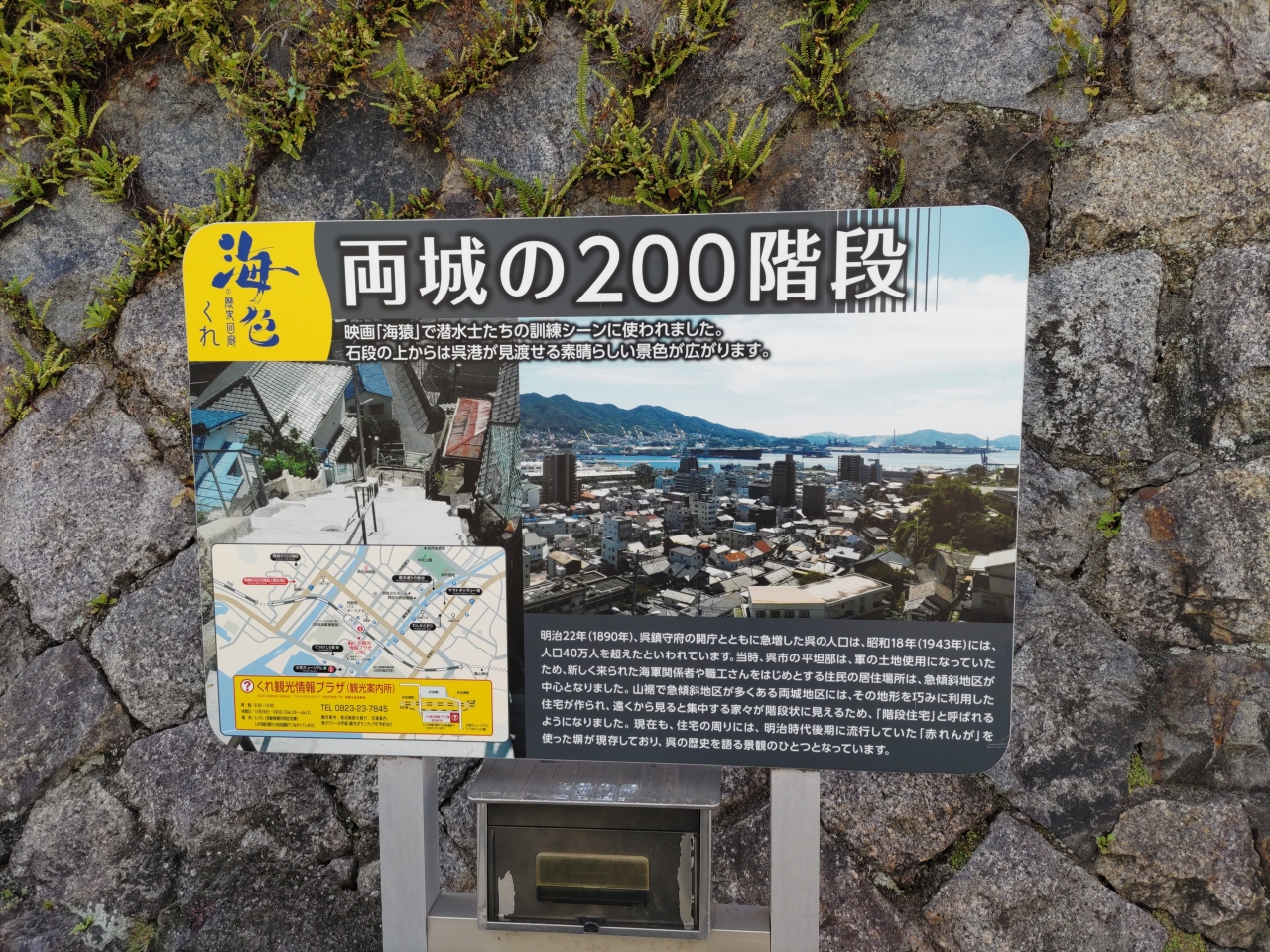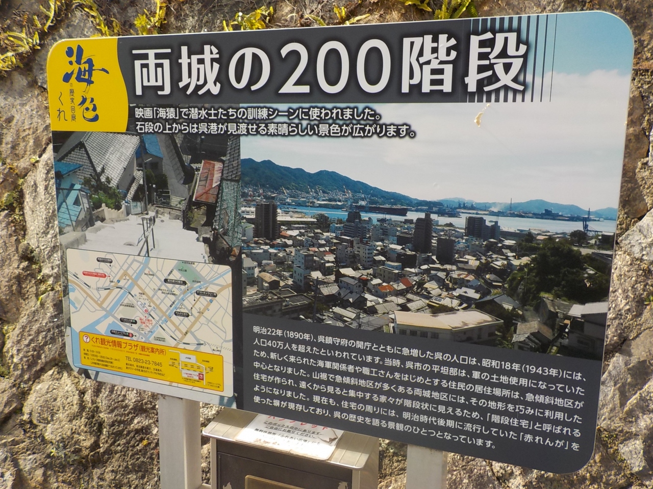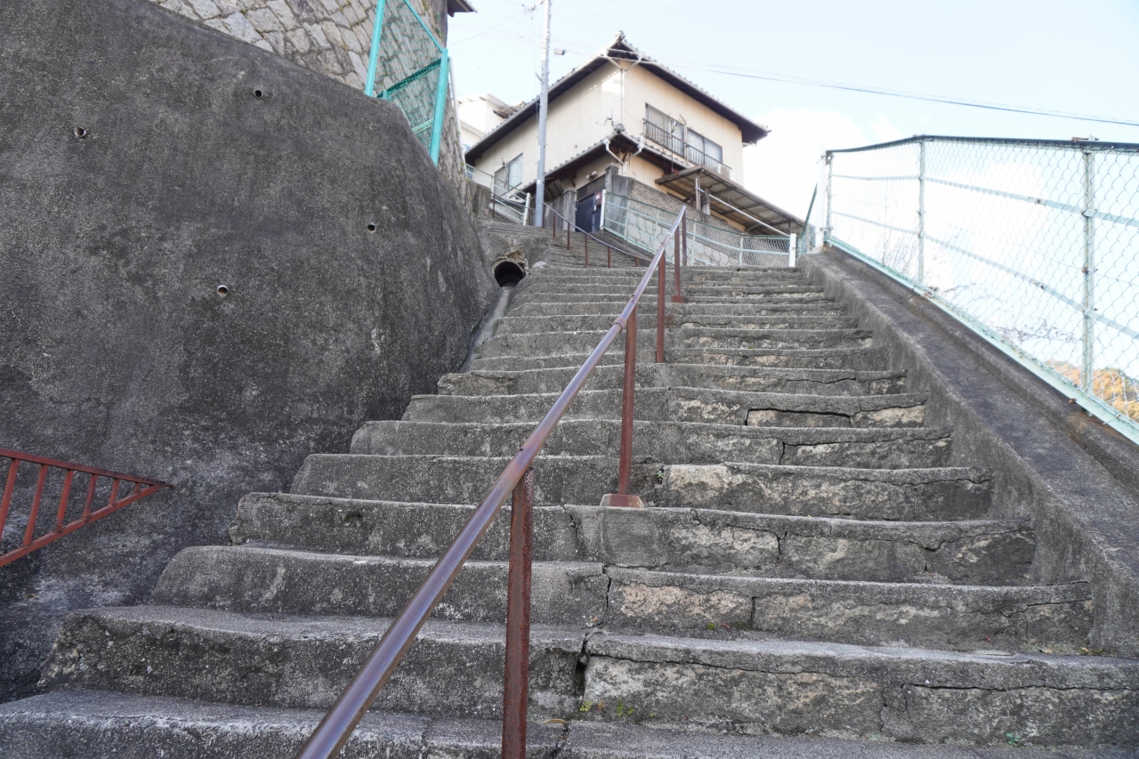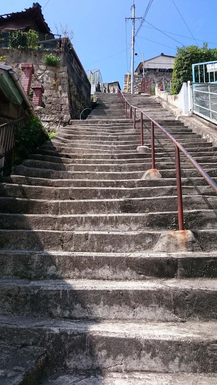 海猿のロケ地でお馴染みの両城 特に海猿のファンな訳ではなく、階段住宅を見てみたくて行って来ましたが、とにかく怖くて登... 続きを読むりきれません。 あー私、高所恐怖症だったんだ… 腰が引けて全然ダメです(笑) もちろん登りも怖いのですが、下りも泣きそう! 日本海軍で発展した呉市には、たくさんの人達が集まり、平地の少ないこの街では、斜面に住宅が沢山建てられました。 職場まで満員電車で1時間かけて通勤するのか、恐ろしく急な階段を登り降りして通勤するのか、どちらが良いのでしょうか(笑) こりゃ、過酷だ! 両城には美しい煉瓦の塀があるはずなのですが、高所恐怖症+方向音痴の私には、結局見つけられませんでした(T . T) 近くには防空壕があり、初めて見る事が出来ました。 閉じる
