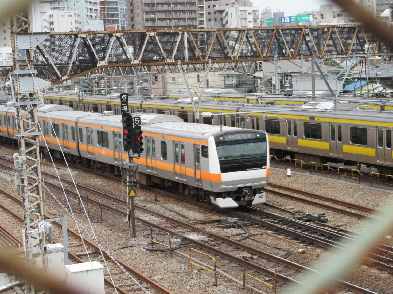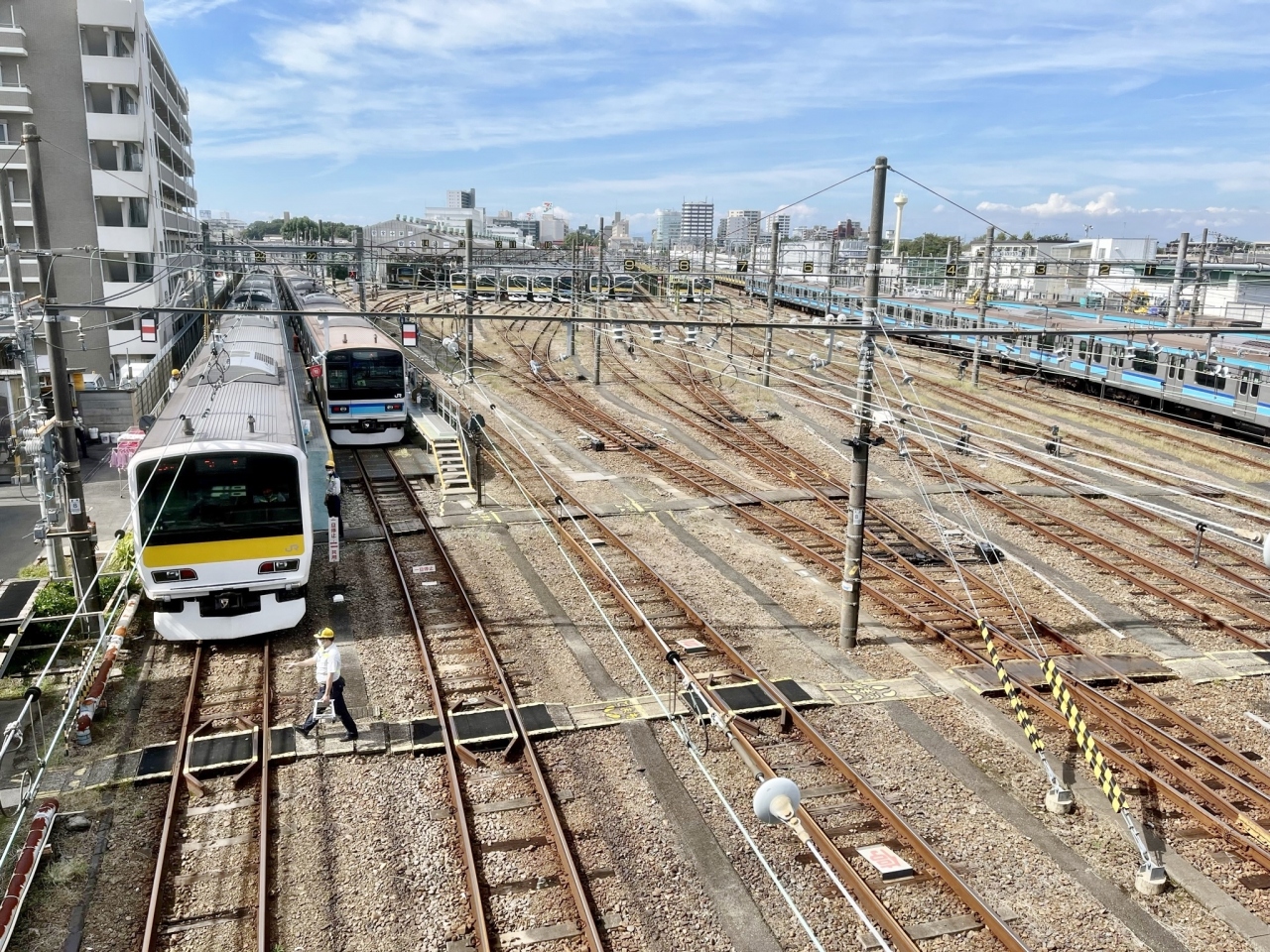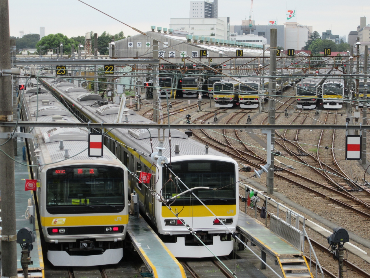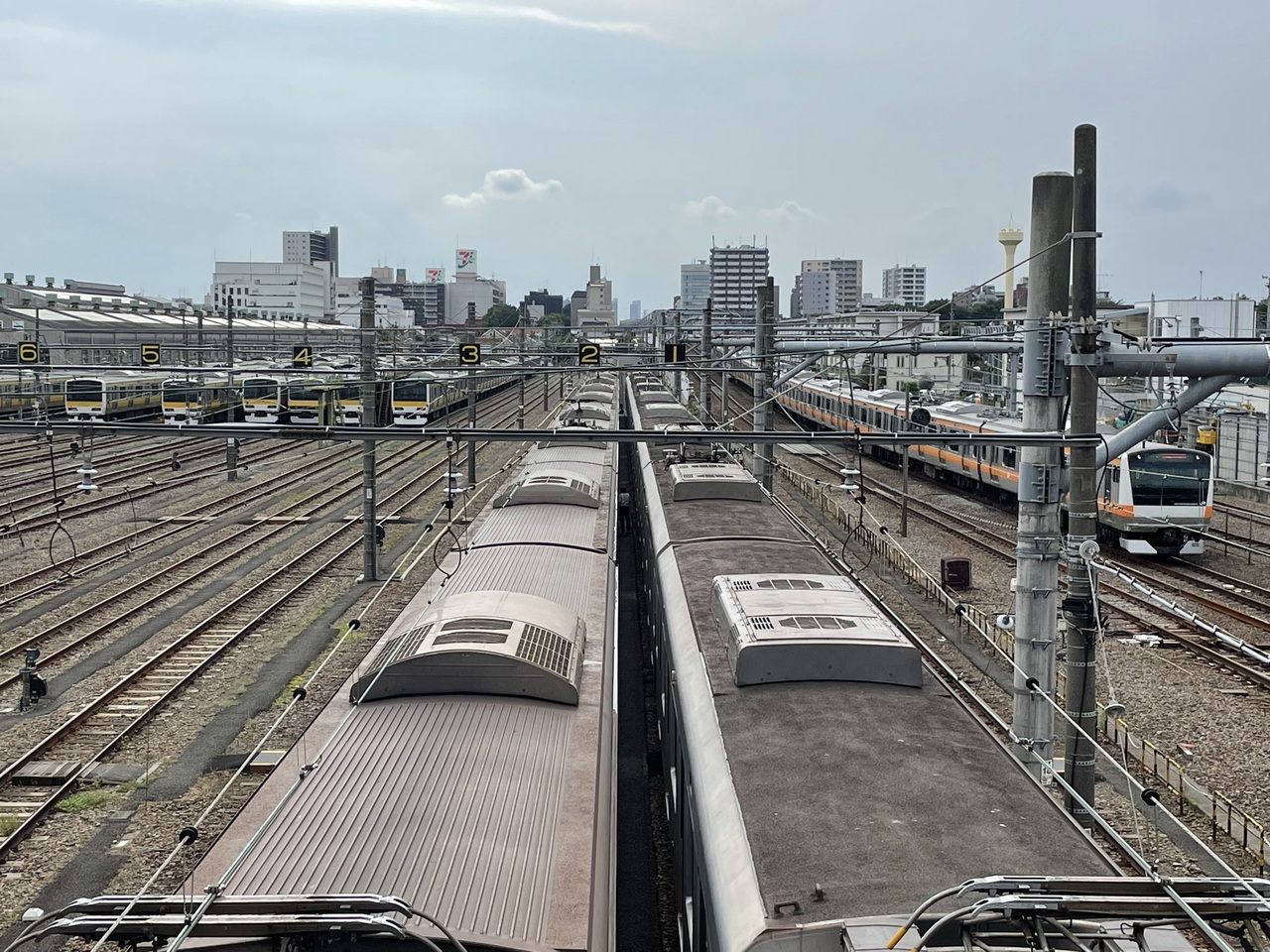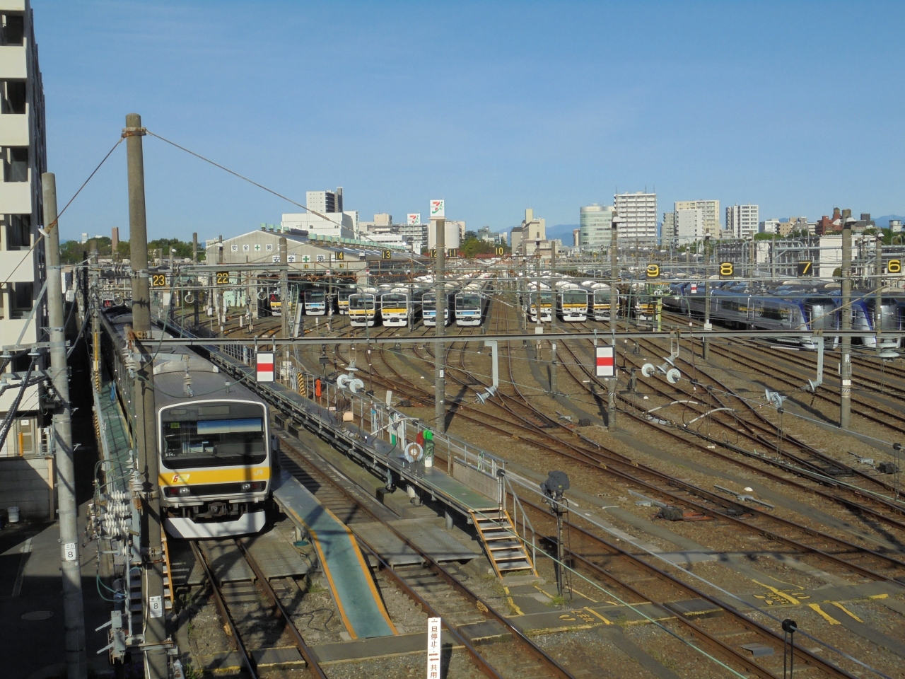 当時の映像ではアルプス号などで活躍した165系電車や、甲府行きの表示幕を掲げたスカ色の115系電車が車庫内に留置されていますが、今は中央緩行線や東西線乗り入れ用の車両が主力。銀色の車体は何となく物足りなさを感じてしまいます。